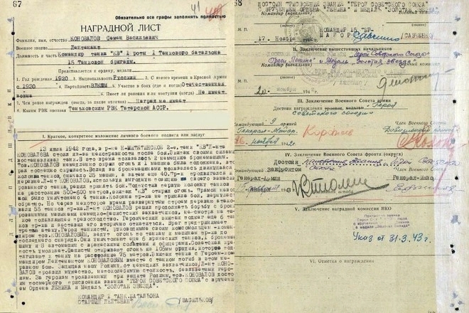 Хутор Нижнемитякин, Ростовская область. Здесь 13 июля 1942 года экипаж «КВ-1» в неравном бою уничтожил 16 немецких танков. Семена Коновалова, командира, посмертно представили к званию Героя Советского Союза, на его родину, в Татарию, ушла похоронка… В том, что «КВ» оставили в одиночестве на окраине хутора, не было никакого стратегического расчета. Накануне, в бою, танк получил повреждения и двигаться дальше не мог. Танковая бригада ушла, а экипаж остался возле машины. Едва успели починить и спрятаться в лощине, как нарисовалась вражеская разведка на бронетранспортерах. Один успели подбить… Что было потом, установила наша разведка - ее командир бригады отправил на следующий день в Нижнемитякин, чтобы узнать судьбу экипажа. Разведчики обнаружили на месте сожженный «КВ» и обгоревшие тела. Вокруг нашей машины еще дымились 16 подбитых немецких танков, два бронетранспортера… Местные жители рассказали: вскоре после того, как был подбит немецкий бронетранспортер, на хутор двинулись танки. Спрятавшийся в лощине «КВ» уничтожил четыре, немцы отступили. Захлебнулась и вторая атака, в которой гитлеровцы потеряли уже шесть танков. Советский танк все время менял позицию, оставаясь для немцев невидимым, и у них явно сложилось ощущение, что им противостоят несколько советских машин. Танк «КВ - 1» Всего с нашим одиноким «КВ» в этом бою сражались 75 немецких танков. Шестнадцать из них экипаж Коновалова уничтожил. Под занавес боя, когда «КВ» уже не мог двигаться, немцы расстреливали его из 105-миллиметровой пушки. У наших танкистов закончились снаряды, Семен Коновалов приказал экипажу покинуть машину. Командир, наводчик Дементьев и техник-лейтенант Серебряков выбрались из горящей машины через нижний люк, заряжающий, два механика-водителя, стрелок–радист не успели (их обгоревшие тела и обнаружили разведчики, ошибочно решив, что не выжил никто). К своим Семен Коновалов и два его товарища пробирались несколько суток. На четвертые - захватили немецкий танк, уничтожив его экипаж. На трофейной машине пробились к своим, попутно раздавив еще несколько грузовиков с гитлеровцами… У этой фантастической истории счастливый конец. Весной 1943 года Семену Коновалову вручили Золотую Звезду Героя, к которой его представляли посмертно. Ему дали отпуск, он смог навестить мать. Правда, когда ночью постучал в окно родительского дома, та, не поверив, залилась слезами: «Уходите! Мой Семён погиб, вот похоронка…». Из наградного листа лейтенанта Семена Коновалова (орфография и пунктуация сохранены): «13 июля 1942 года, в р-не Н-МИТЯКИНСКОЕ 2-е, танк «КВ» л-нта КОНОВАЛОВА стоял из-за неисправности после боя. Экипаж своими силами восстанавливал танк. В это время показалось 2 немецкие бронемашины. Тов. КОНОВАЛОВ немедленно открыл огонь и 1 машина была подожжена, вторая поспешно скрылась. Вслед за бронемашинами показалась движущаяся колонна танков, сначало 35 машин, а затем еще 40. Противник продвигался к деревне. Л-нт КОНОВАЛОВ, используя выгодную позицию своего замаскированного танка, решил принять бой. Подпустив первую колонну танков на расстояние 500-600 метров, экипаж «КВ» открыл огонь. Прямой наводкой было уничтожено 4 танка. Колонна противника не приняла бой, вернулась обратно. Но через некоторое время развернутым строем деревню атаковали 55 танков пр-ка. Л-нт КОНОВАЛОВ решил продолжи