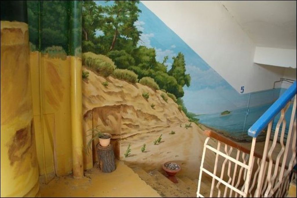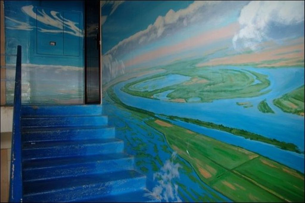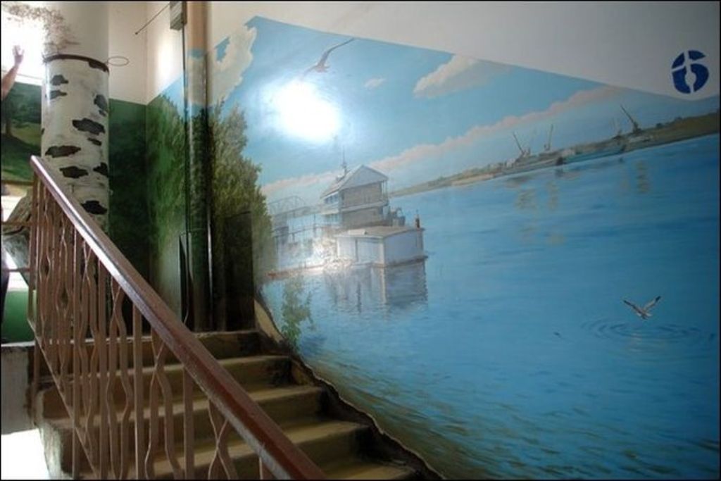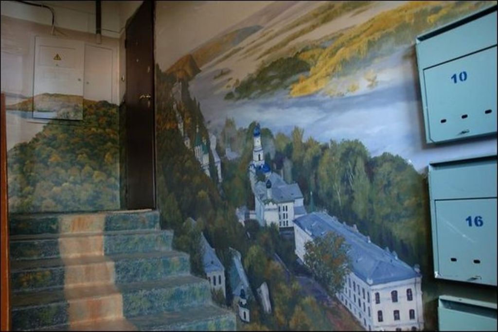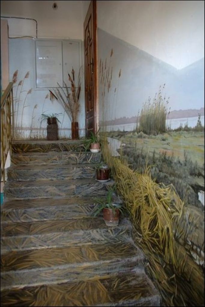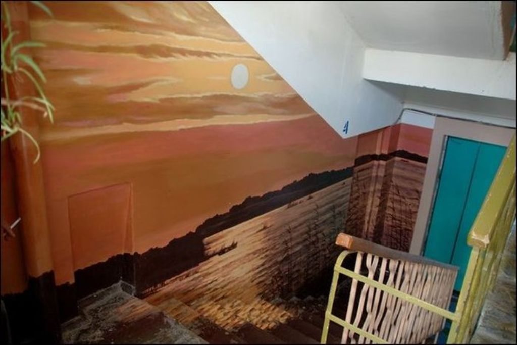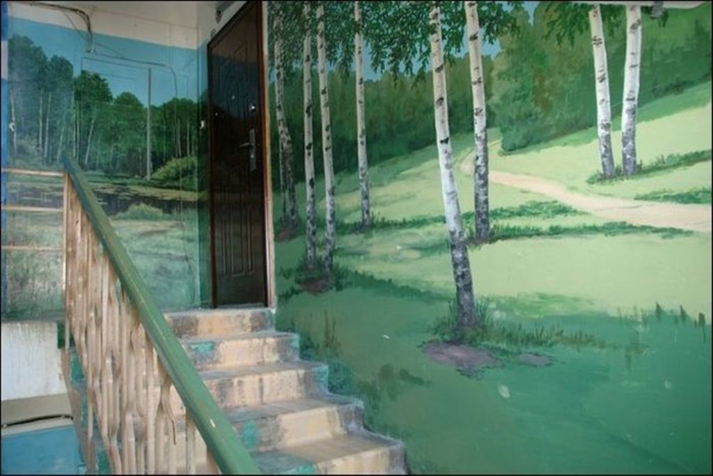Когда жители дома по улице Московская заходят к себе домой, они чувствуют себя, словно попали на природу. Первый этаж — березовая роща, второй этаж — речные просторы. Все стены — пейзажи. Такой необычный холст выбрал для себя Борис Черниченко, бывший житель этого дома, профессиональный художник. С красками помогали соседи. Чтобы украсить все восемь этажей понадобилась не одна неделя. Каждая площадка имеет свой колорит и тему.