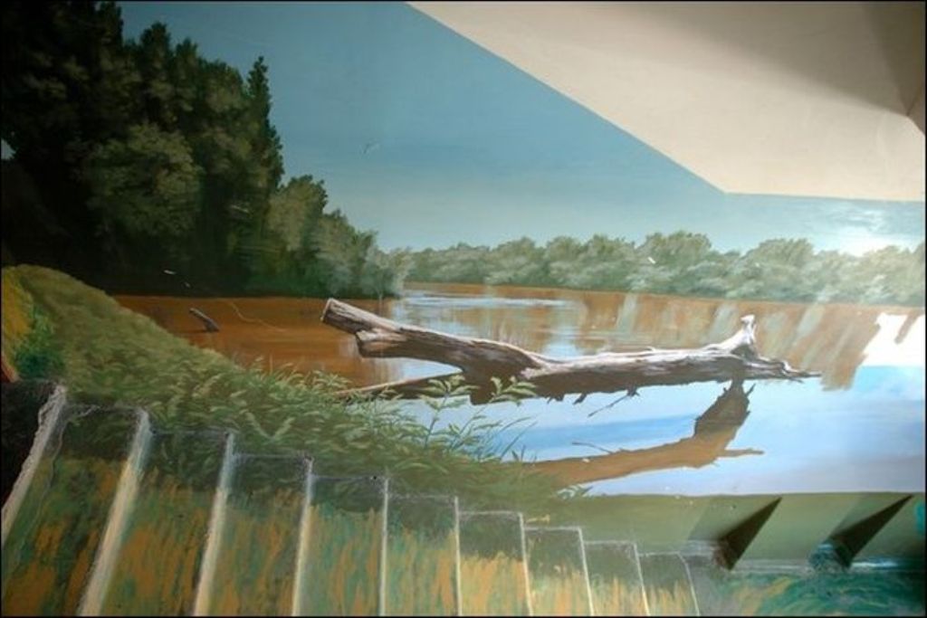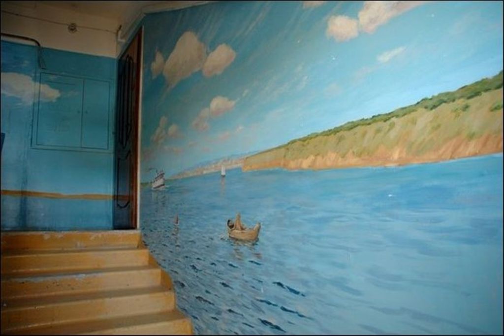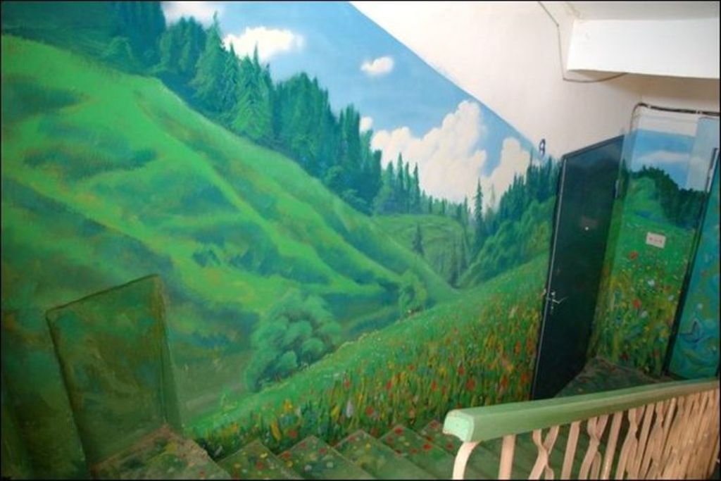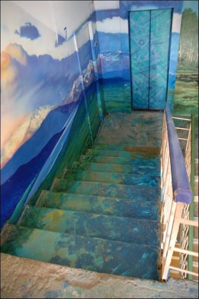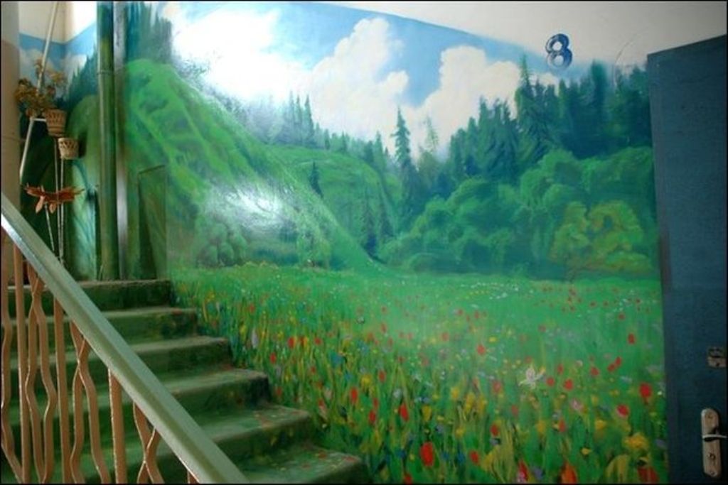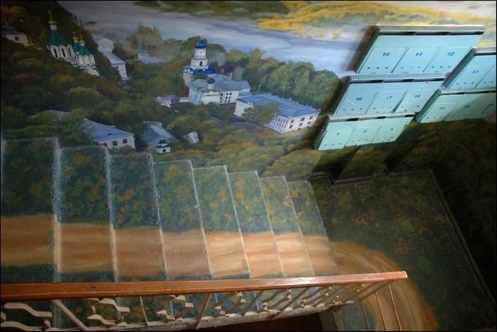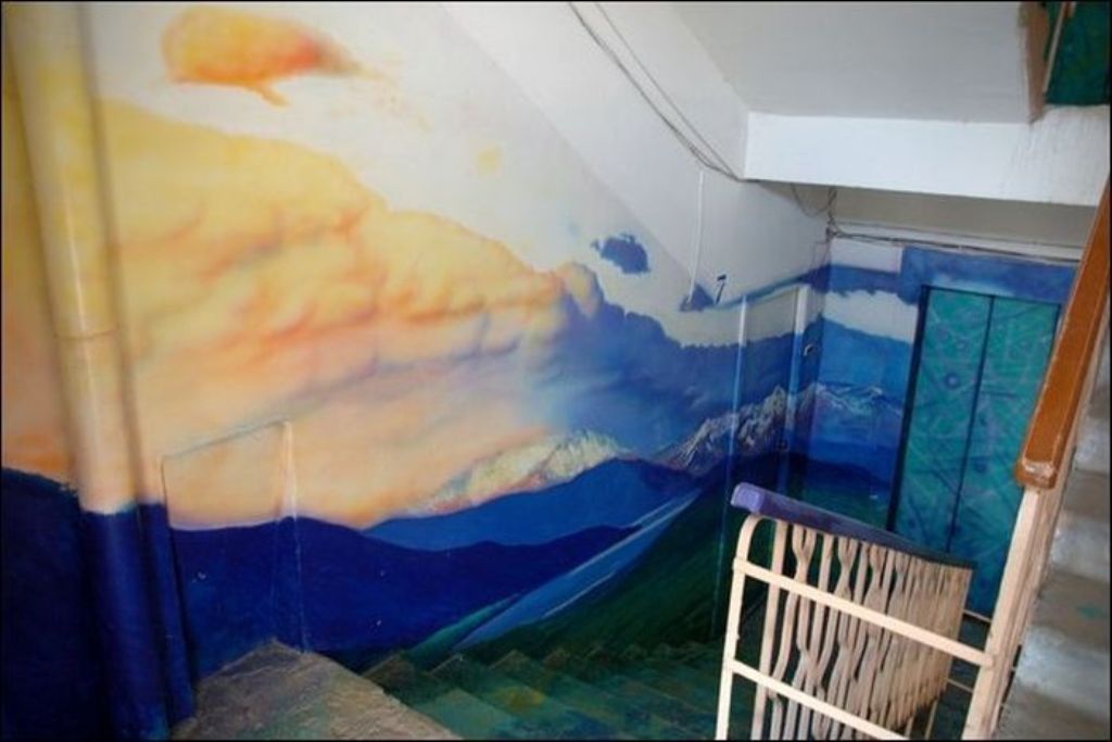 Когда жители дома по улице Московская заходят к себе домой, они чувствуют себя, словно попали на природу. Первый этаж — березовая роща, второй этаж — речные просторы. Все стены — пейзажи. Такой необычный холст выбрал для себя Борис Черниченко, бывший житель этого дома, профессиональный художник. С красками помогали соседи. Чтобы украсить все восемь этажей понадобилась не одна неделя. Каждая площадка имеет свой колорит и тему.