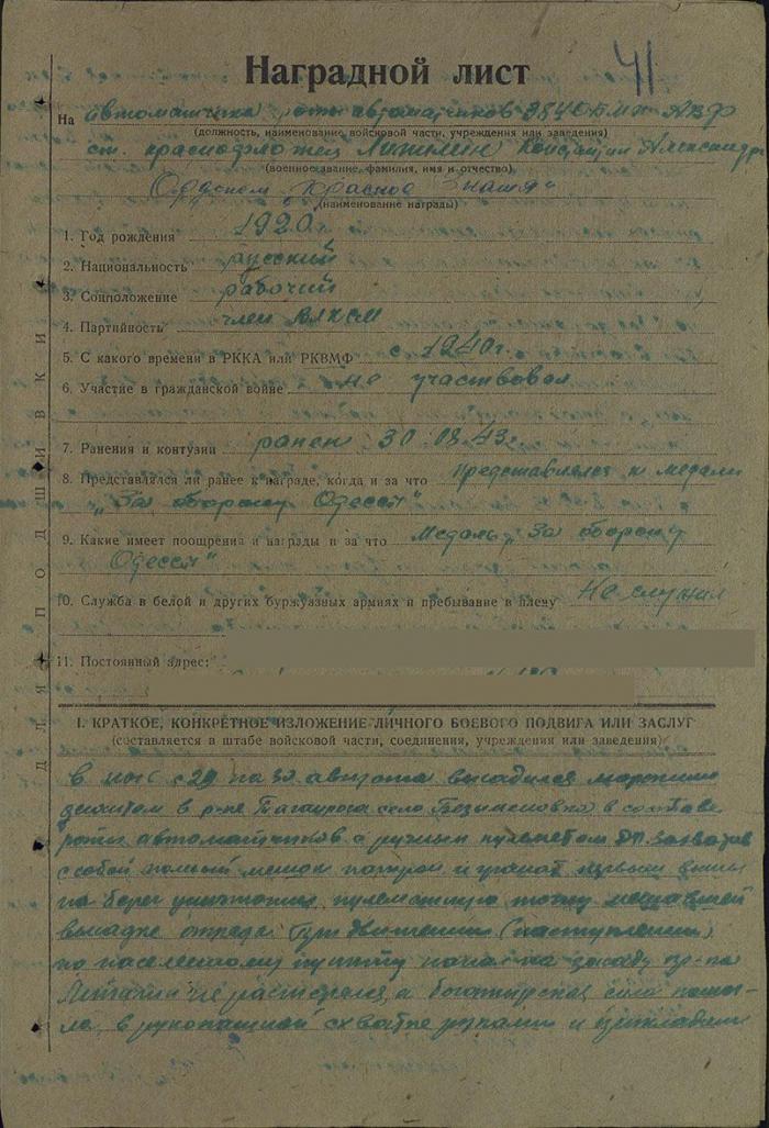 Из наградного листа на пулемётчика роты автоматчиков 384 отдельного батальона морской пехоты Азовской военной флотилии старшего краснофлотца Константина Александровича Липилина (для удобства чтения позволил себе исправить ошибки и разделить текст на абзацы):