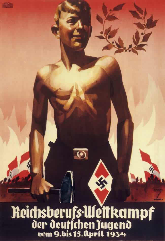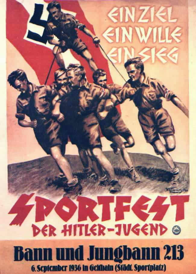 Начиная 1936 года участие в гитлерюгенде для немецких детей стало фактически обязательным. После проверки их семей на "расовую чистоту" и сдачи ими определенных теоретических и практических экзаменов в день рождения фюрера почти все дети, достигавшие 10-летнего возраста, в торжественной обстановке ежегодно принимали в ряды этой организации. В гитлерюгенде важнейшее внимание уделялось таким темам, как расовая теория, политика народонаселения, немецкая история и политическое страноведение. Но намного важнее, чем умственное воспитание, было воспитание физическое. В основу спортивного развития ставились соревнования. С 1935 года ежегодно стали проводиться спортивные состязания рейха - по лёгкой атлетике, рукопашному бою и командному спорту, а с 1937 года была введена стрельба из огнестрельного оружия. С началом Второй мировой войны члены гитлерюгенда стали заниматься сбором вторсырья, денежных средств, одеял и одежды для отправки на фронт солдатам. Каждый час членов гитлерюгенда был занят до предела - у молодёжи едва оставалось время для своих семей. Большинство родителей не возражало против подобного распорядка, потому что их дети росли дисциплинированными и были лишены возможности заниматься праздностью и бездельем.