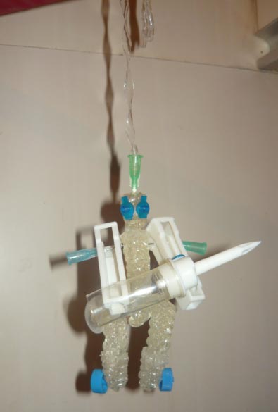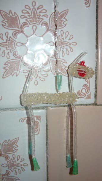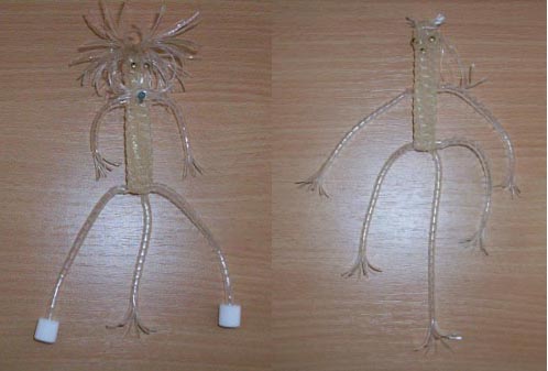 Чтобы придать яркость изготовленным поделкам их раскрашивали марганцовкой, зеленкой или же фломастерами. В общем, кто на что горазд. Голову и другие части тела прикрепляли иглой для капельницы.