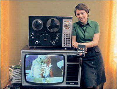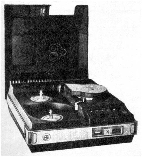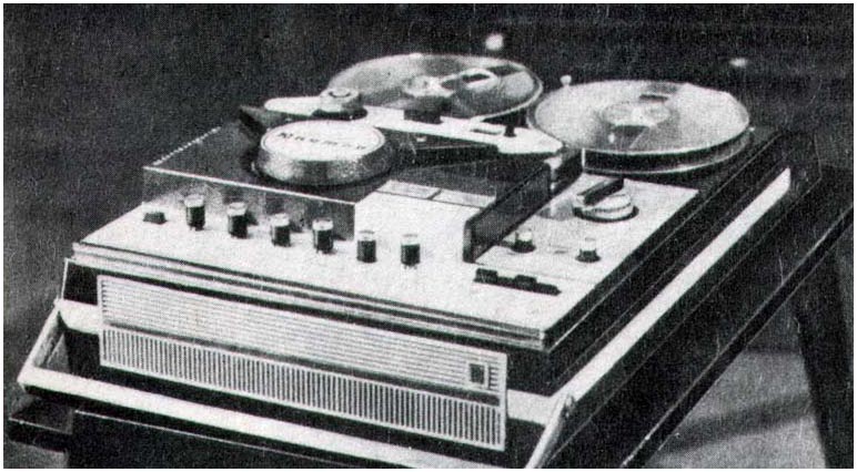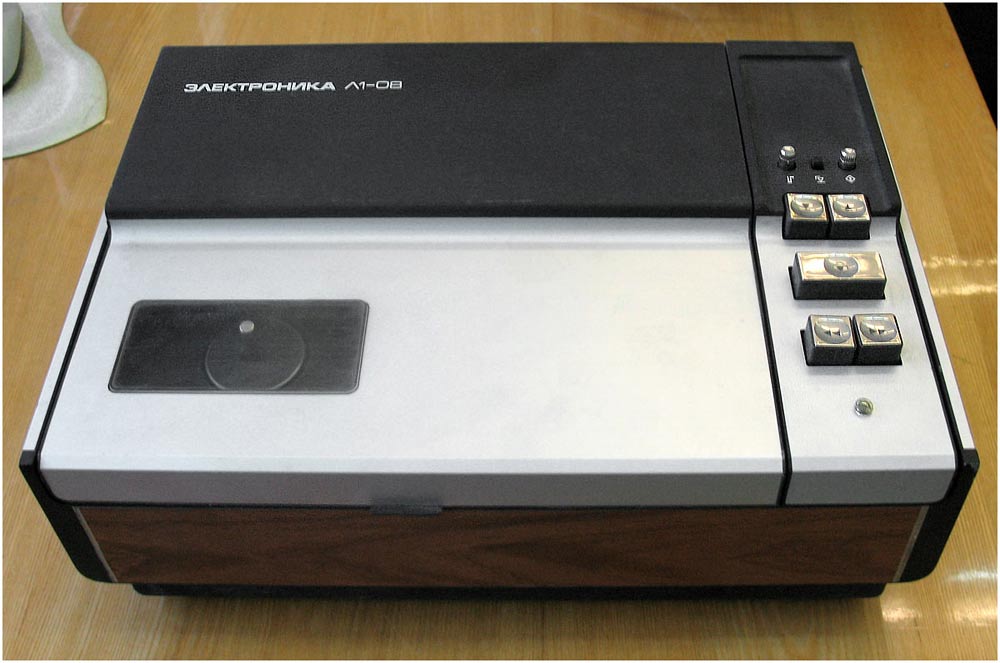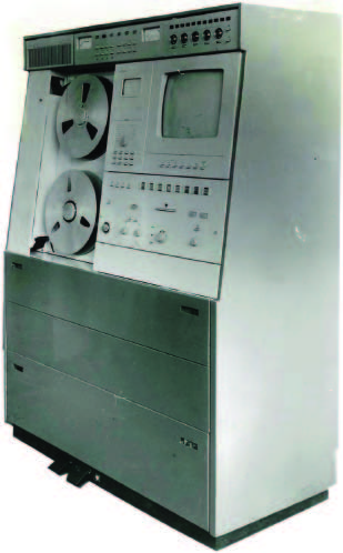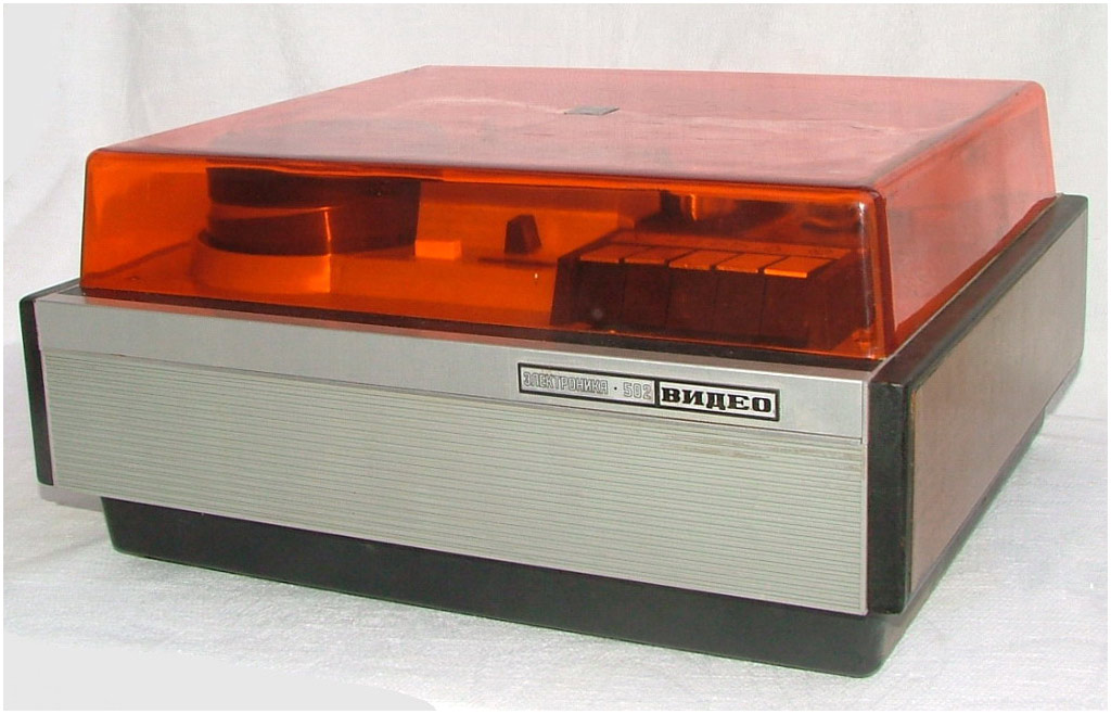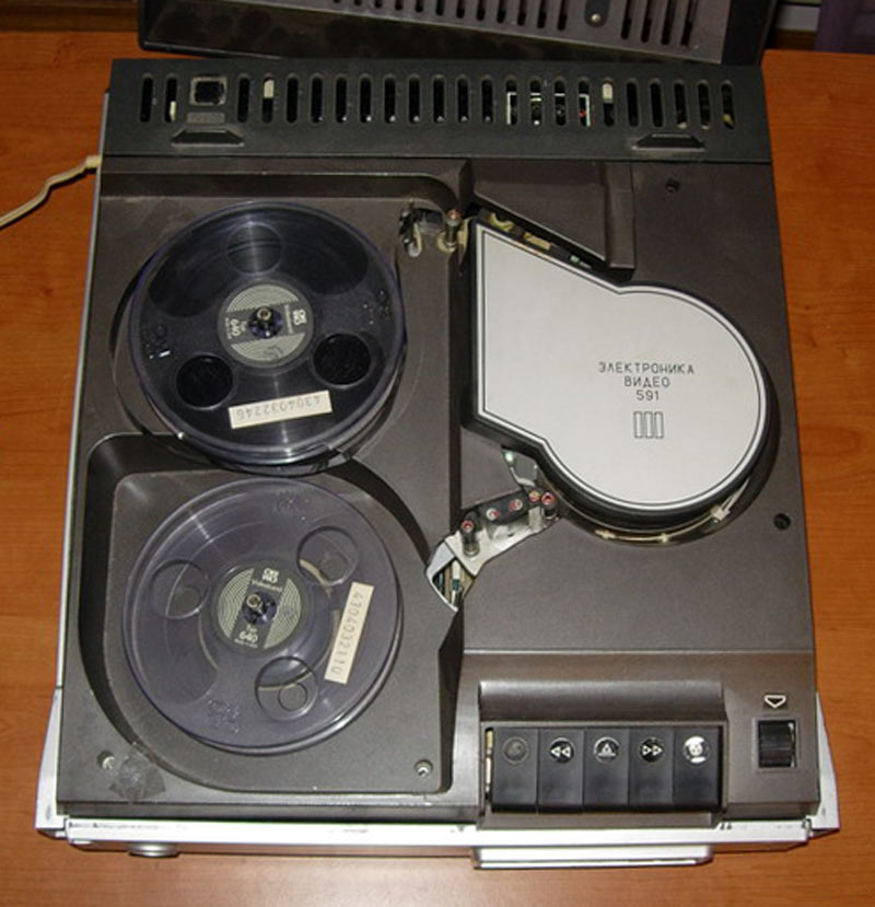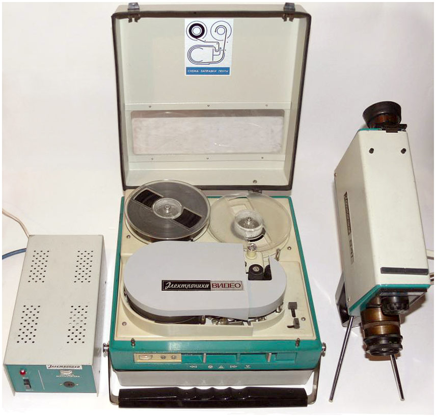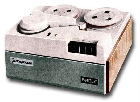 Катушечный видеомагнитофон «Электроника-Видео» 1973 г. Стационарный видеомагнитофон - ""Электроника-Видео"" предназначен для записи и последующего воспроизведения звуковой и видеоинформации. В видеомагнито фоне используется наклонно-строчная система видеозаписи с двумя специальными вращающимися головками. Это позволило получить достаточно высокую относительную скорость видеоголовка/магнитная лента, необходимую для записи широкой полосы частот видеосигнала. Запись изображения можно вести с видеокамеры ""Электроника-видео"" и любого телевизора через специальное согласующее устройство на хромоксидную магнитную ленту шириной - 12,7 мм. Скорость движения ленты - 15,88 см/с. Диаметр катушки - 150 мм. Диаметр барабана 115,82 мм. Относительная скорость видеоголовка/лента 9,2 метра в секунду. Время записи при использовании ленты толщиной 27,5 мкм, около 45 минут. Разрешающая способность 250 линий. Розничная цена - 2500 руб.