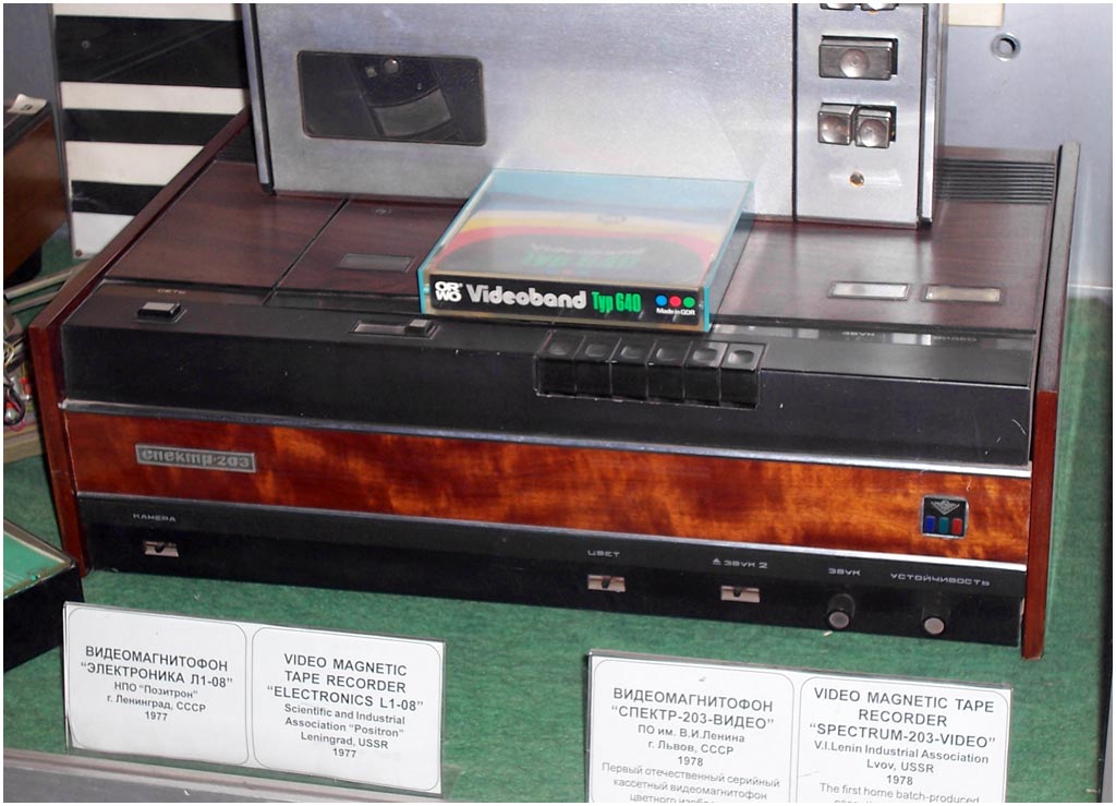 Видеомагнитофон-приставка «Спектр-203» 1974 г. Первый в стране кассетный цветной видеомагнитофон-приставка ""Спектр-203-видео"" предназначен для записи и воспроизведения цветных и чёрно-белых телевизионных программ, с использованием телевизоров оборудованных устройством сопряжения, входящим в комплект и с телевизионных камер. В аппарате используется наклонно-строчный способ записи видеоинформации двумя вращающимися видеоголовками и продольный способ для записи звукового сопровождения и управляющих сигналов. Носителем информации служит магнитная лента шириной 12,7 мм, помещенная в специальную кассету - ВК-30 или ВК-45, время записи соответственно 30 и 45 мин. Заправка ленты в тракт и выключение аппарата в начале или конце магнитной ленты осуществляются автоматически.