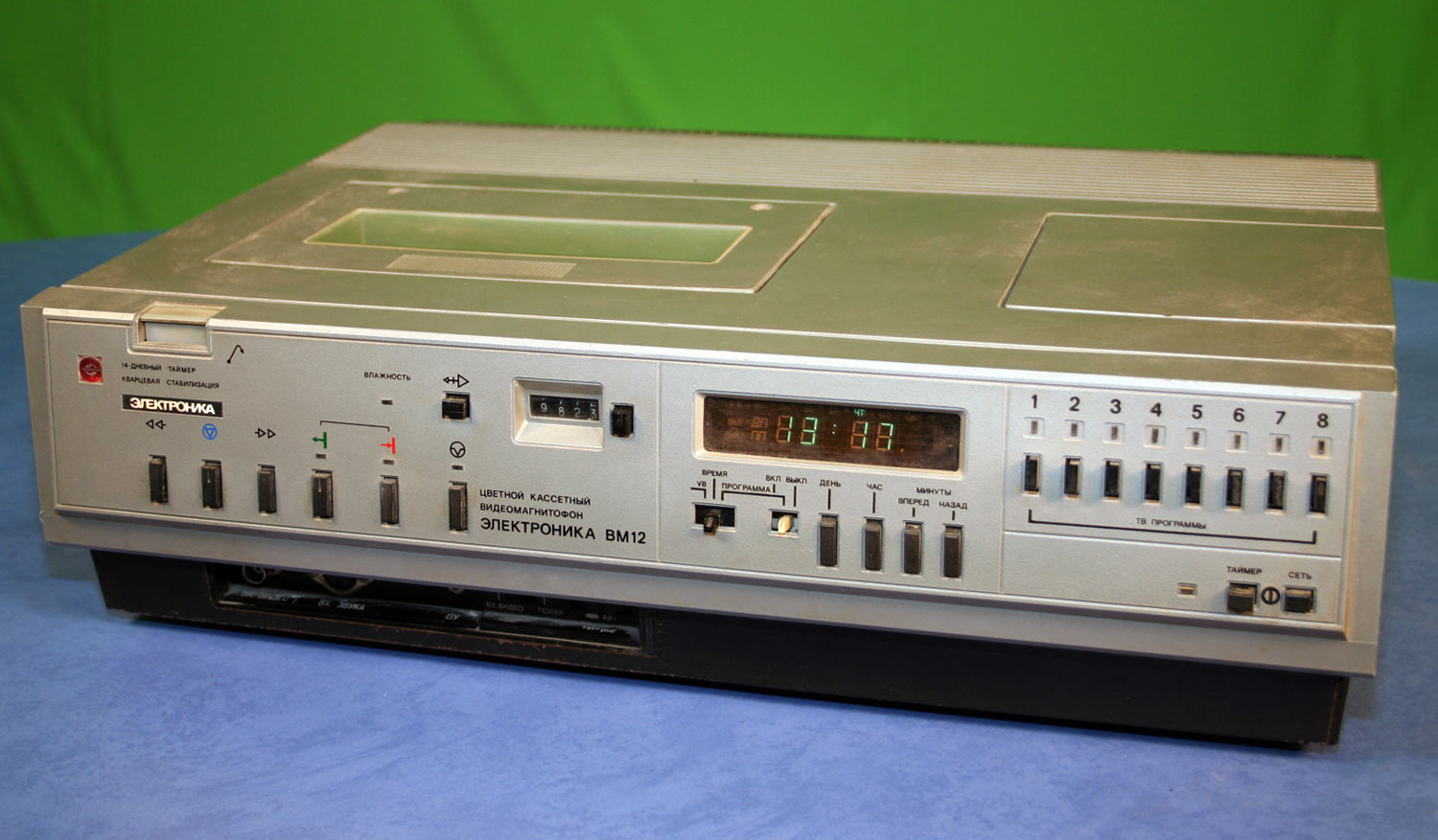 Кассетный видеомагнитофон – «Электроника ВМ-12» 1984 г. Видеомагнитофон ""Электроника ВМ-12"" - отечественная копия японского видеомагнитофона ""Panasonic NV-2000"" выпущенного ещё в 1975 году. Бытовой видеомагнитофон ""Электроника ВМ-12"" предназначен для записи цветных и чёрно-белых телевизионных программ, в 1...3 частотных диапазонах по ГОСТ 7845-79, в зоне уверенного приёма непосредственно с телевизионной антенны на магнитную ленту в кассетах типа ВК-30, ВК-120, ВК-180 и их последующего воспроизведения на 6-м, или 7-м каналах телевизора или через видеовыход. Кроме того, тракт видеозаписи аппарата позволяет записывать видеопрограммы с другого видеомагнитофона и просматривать записи, сделанные на других видеомагнитофонах данного типа. Система видеозаписи наклонно-строчная с использованием двух вращающихся видеоголовок. Видеомагнитофон - производили несколько заводов, в трёх вариантах оформления.