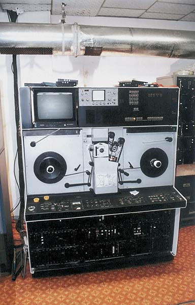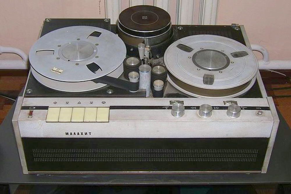 Катушечный транзисторный видеомагнитофон «Малахит» 1967 г. Катушечный видеомагнитофон "Малахит" - позволяет записывать на магнитную ленту шириной 25,4 мм телевизионные программы в ч/б изображении с любого телевизора, а с помощью прилагаемой к видеомагнитофону портативной телевизионной камеры и любые сюжеты в помещении и на открытом воздухе. Одновременно осуществляется запись звукового сопровождения. Полоса записываемых и воспроизводимых частот видеосигнала от 50 Гц до 2,2 Мгц. Число воспроизводимых градаций яркости 7. Вре мя непрерывной записи около 40 минут. Габариты ВМ - 570х435x250 мм. Вес - 36 кг.