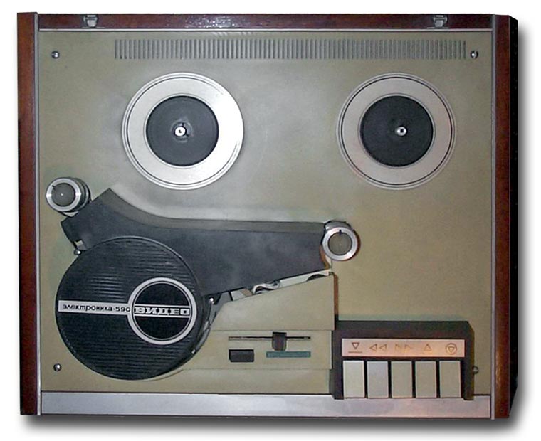 Катушечный видеомагнитофон «Электроника-590-видео» 1978 г. Видеомагнитофон предназначен для записи ч/б видеоинформации и звука на специальную магнитную ленту, с последующим воспроизведением. Видеомагнитофон обеспечивает запись звуковой и видеоинформации с телевизора или видеокамеры; запись звука с микрофона; воспроизведение записи на телевизоре; прослушивание звукового сопровождения на головные телефоны; стирание ранее записанной информации, перемотку магнитной ленты в любом направлении.