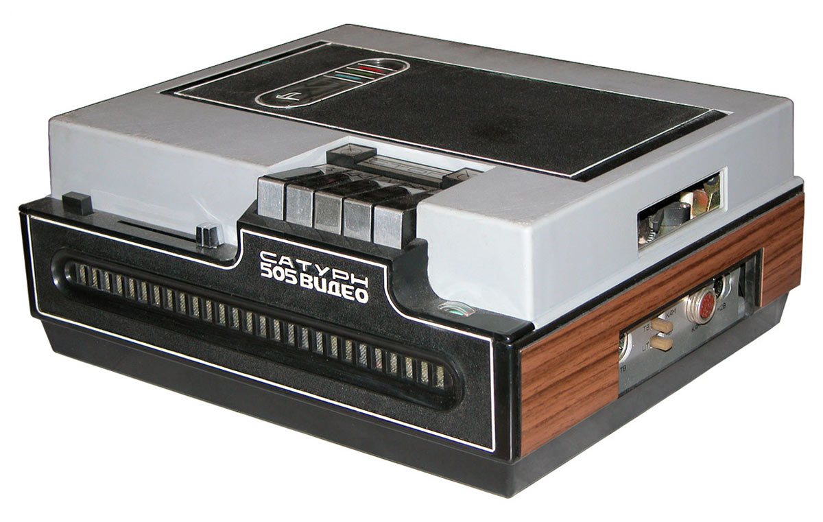 Видеомагнитофон «Сатурн-505-видео» 1979 г. ""Сатурн-505 видео"" и ""Электроника-505 видео"" - транзисторно-интегральные цветные кассетные магнитофоны с наклонно-строчным способом записи двумя вращающимися видеоголовками. Они предназначены для записи и последующего воспроизведения цветных и черно-белых видеосигналов, а также звукового сопровождения от телевизионного приёмника с согласующим устройством УСЦТ-2. Кроме того, обе модели позволяют производить любительскую запись черно-белой видеоинформации и звукового сопровождения от видеокамеры. При значительно меньших габаритах, массе и потребляемой мощности новые модели имеют более высокие технические и эксплуатационные параметры, чем серийно выпускаемый видеомагнитофон ""Спектр-203-видео"". Питаются оба видеомагнитофона от сети переменного тока через встроенный блок питания БПВМ или от аккумуляторов. Обе модели одинаковы и выпускались для расширения наименований.