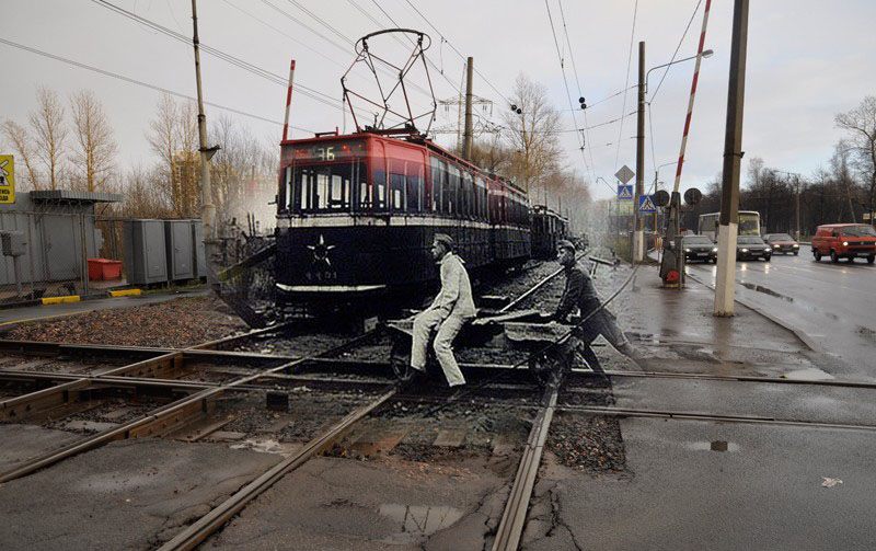 1941-2011 Ж-д переезд на Петергофском шоссе. Немцы у ленинградских трамваев на окраине Города