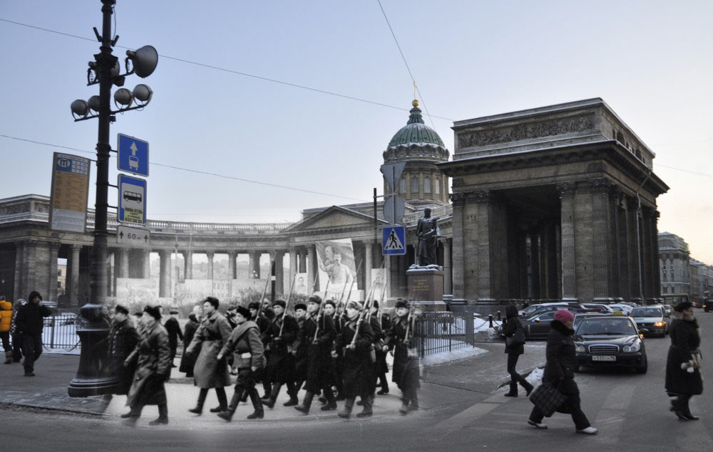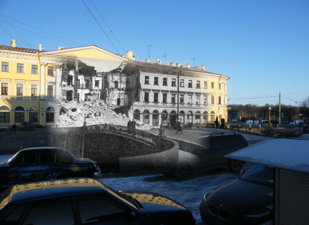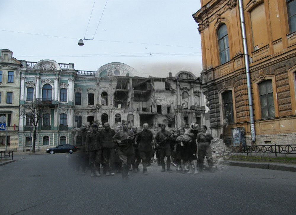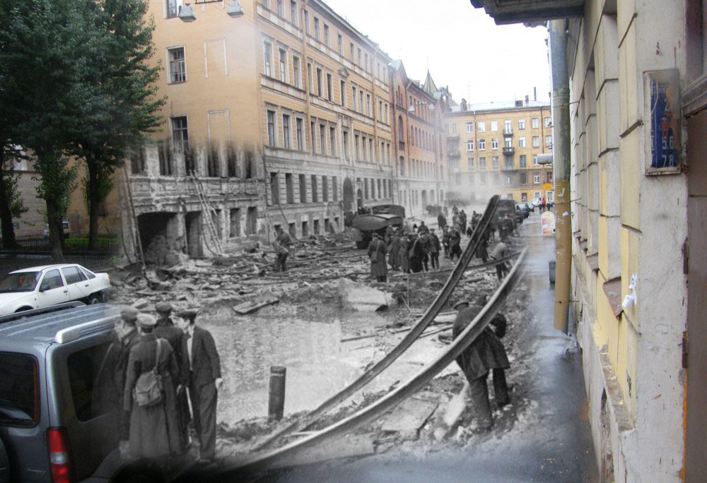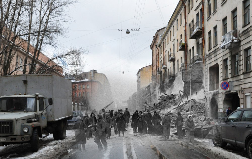 Продолжаю серию коллажей петербуржца Сергея Ларенкова, о блокаде Ленинграда. На каждом снимке максимально точно совмещены кадры одного и того же места, но сделанные в разное время: в годы блокады Ленинграда – и сейчас, в начале двадцать первого века.