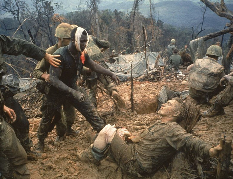 Морские пехотинцы во время войны во Вьетнаме. Темнокожий солдат тянется к своему раненому белому товарищу