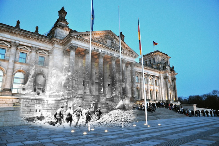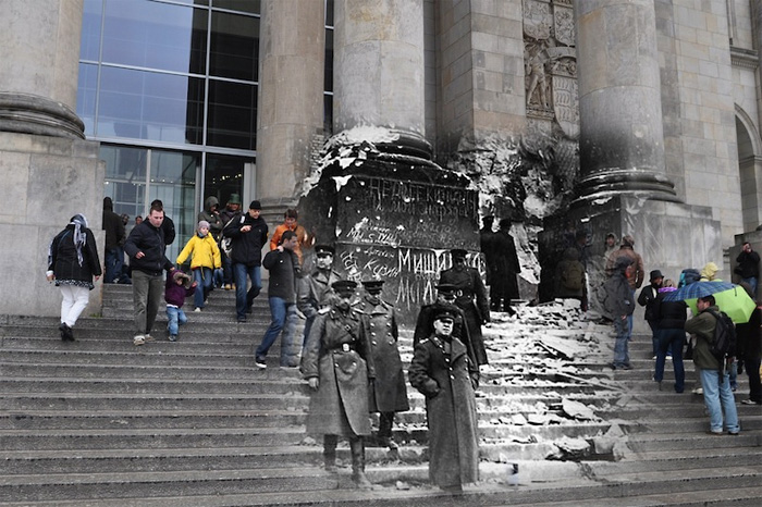 Совмещение снимка, сделанного много лет назад с фотографией, сделанной в наши дни – интересная тенденция, наблюдающаяся у современных фотомастеров. Так, отечественный фотограф Сергей Ларенков создал потрясающие коллажи, «оживляя» призраков Второй Мировой войны войны в своем фотопроекте.