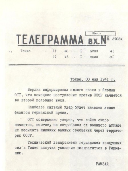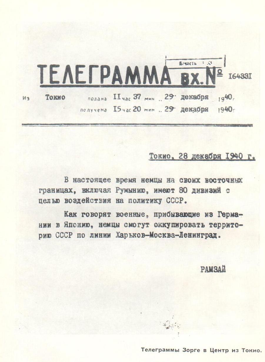 28 декабря 1940 года «Рамзай» радировал:«На германо-советских границах сосредоточено 80 немецких дивизий. Гитлер намерен оккупировать территорию СССР по линии Харьков – Москва – Ленинград…».