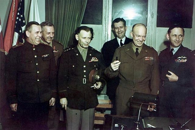 7 мая 1945 года в 02:41 по среднеевропейскому времени в Реймсе был подписан акт о капитуляции Германии. Однако советский представитель при ставке Эйзенхауэра генерал Иван Суслопаров внёс в документ поправку, согласно которой подписание акта в Реймсе не исключало подписания нового, «полного» акта о капитуляции.