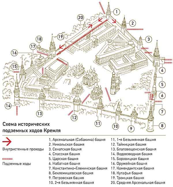Особая доля таинственности отводится подземной части Кремля, окутанной лабиринтами ходов. Именно здесь были найдены комнаты, узкие ходы, колодцы, царские архивы. Практически каждая реставрационная работа, которая проводится в башнях Кремля, сопровождается необычными находками, связанными с миром кремлевских катакомб. Стоит отметить, что держится это все в строжайшем секрете. Возможно, что под Кремлем скрывается настоящий подземный город, ведущий за пределы Москвы. Может быть, поэтому Кремль – один из самых охраняемых военных объектов.