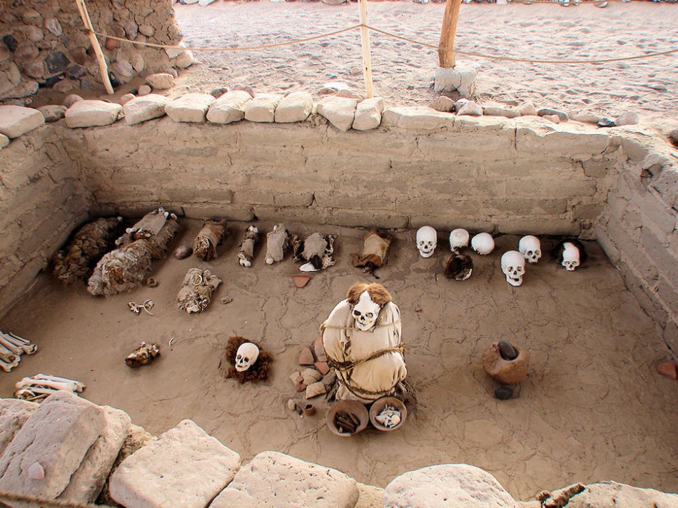 Кладбище Чаучилла, Перу.Кладбище Чаучилла находится примерно в 30 минутах от пустынного плато Наска, на южном побережье Перу. Некрополь был обнаружен в 20-е годы ХХ века. По словам исследователей, на кладбище найдены тела, которым около 700 лет, а последние захоронения здесь проводились в IX веке. Чаучилла отличается от других мест захоронений особым способом, которым хоронили людей. Все тела «сидят на корточках», а их «лица», кажется, замерли в широкой улыбке. Тела прекрасно сохранились благодаря перуанскому сухому пустынному климату. ,