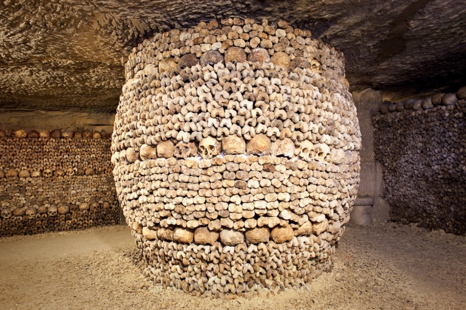 Катакомбы в Париже, Франция.Катакомбы — сеть извилистых подземных туннелей и пещер под Парижем. Общая протяженность, по разным данным, от 187 до 300 километров. С конца XVIII века в катакомбах покоятся останки почти 6 миллионов человек.
