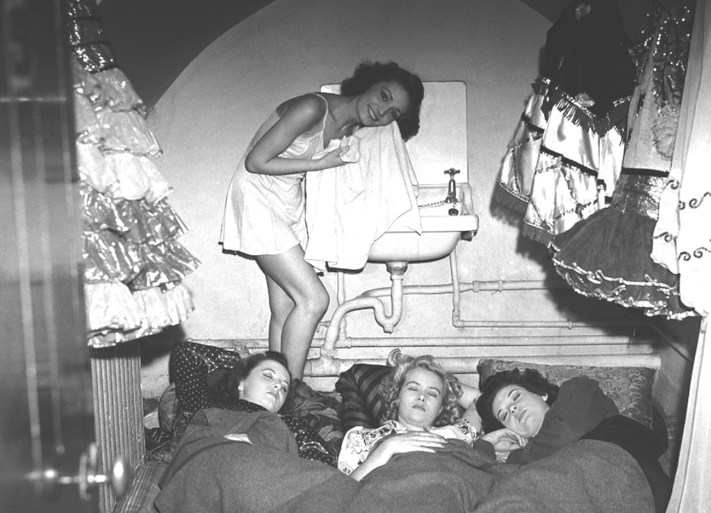 Весело и безопасно в гримерной, Лондон, 1940 Актрисы театра "Ветряная мельница" проводят досуг на работе во время бомбежек