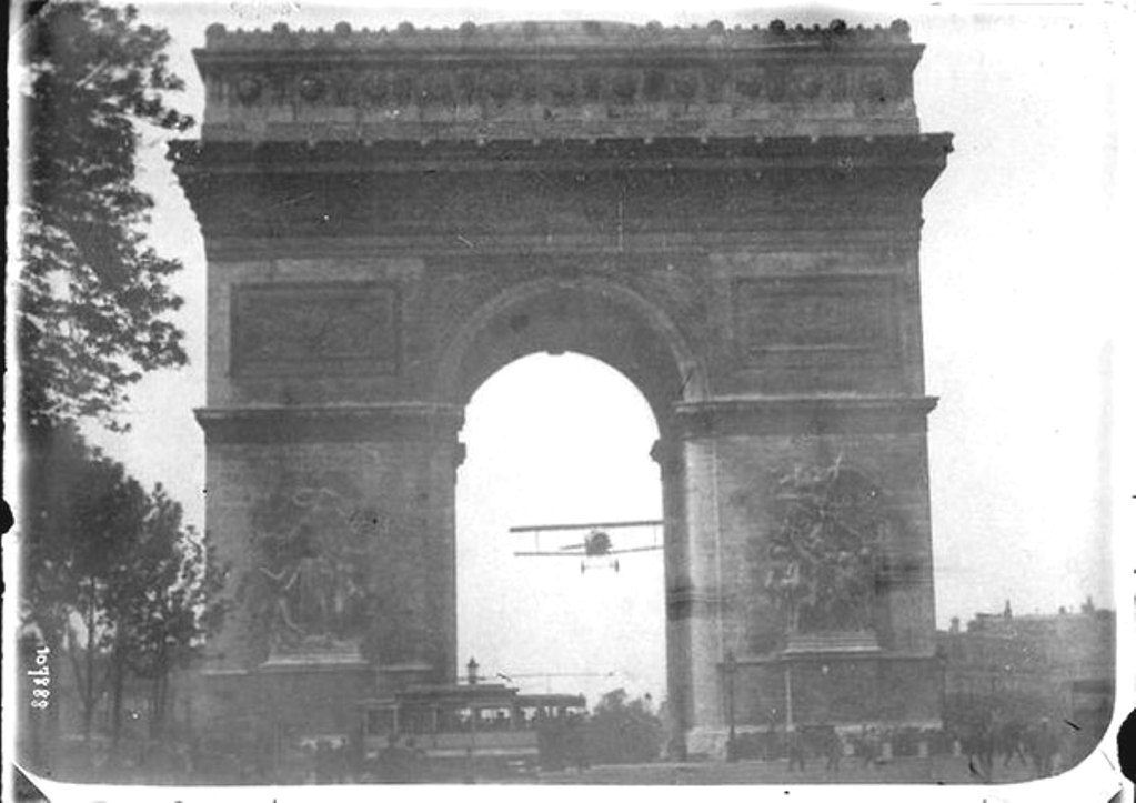 Шарль Годфрой пролетает через Триумфальную арку в Париже на своем самолете «Nieuport 11». 1919 г.