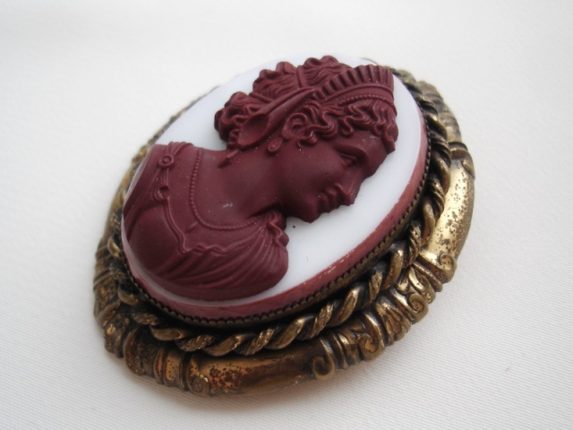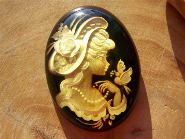 Удивительное очарование камей не только в скрупулезной прорисовке портрета на камне, но и в подобранном для изготовления броши материала. Обычно для камей используют многослойные драгоценные и полудрагоценные камни. Именно за счет многослойности и "играющей" структуры камня достигается выразительность образа, как бы подсвеченного изнутри.