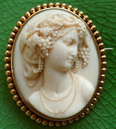 это миниатюрный портрет, с тщательно вырезанными из камня мельчайшими деталями, обычно профиля женской головки, выполненный на камне овальной формы. Фон камеи обычно одного цвета, а барельеф другого. Изображаются на камеях и портреты исторических личностей, небольшие в виде барельефа, сюжеты античной мифологии, и простые бытовые сценки.