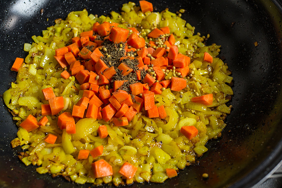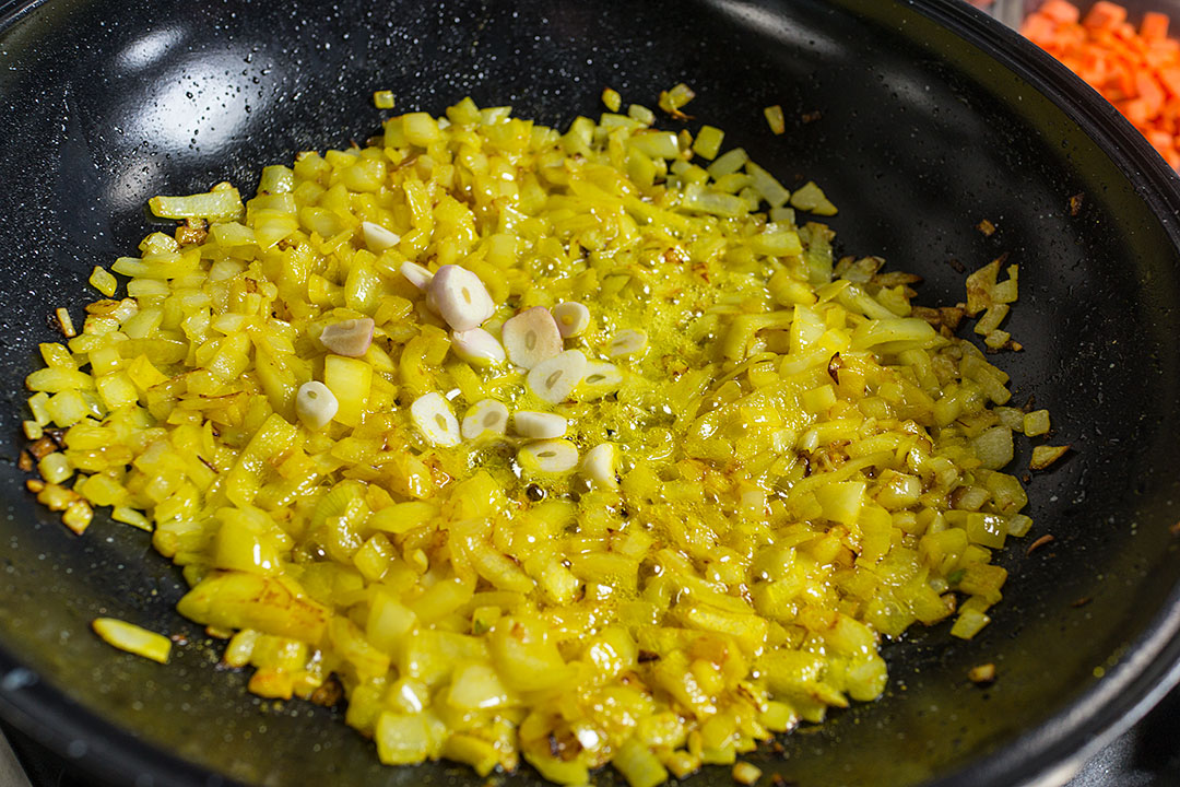 Все как обычно: обжарить в масле лук, добавить куркумы, чеснок, морковь, зиру и кориандр.