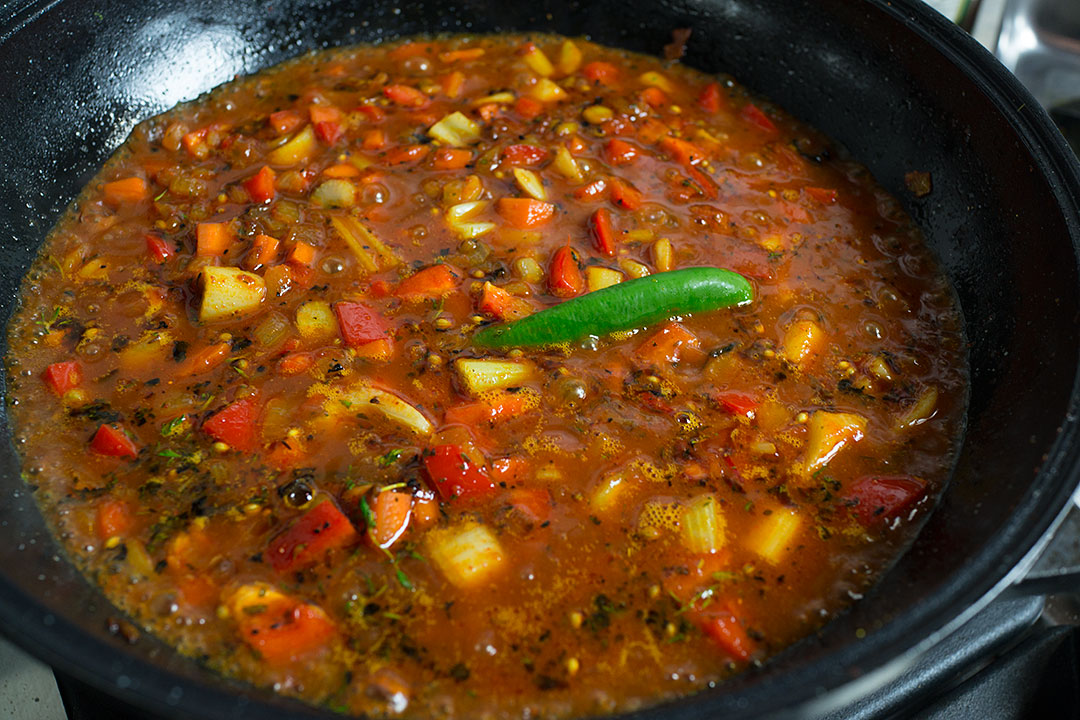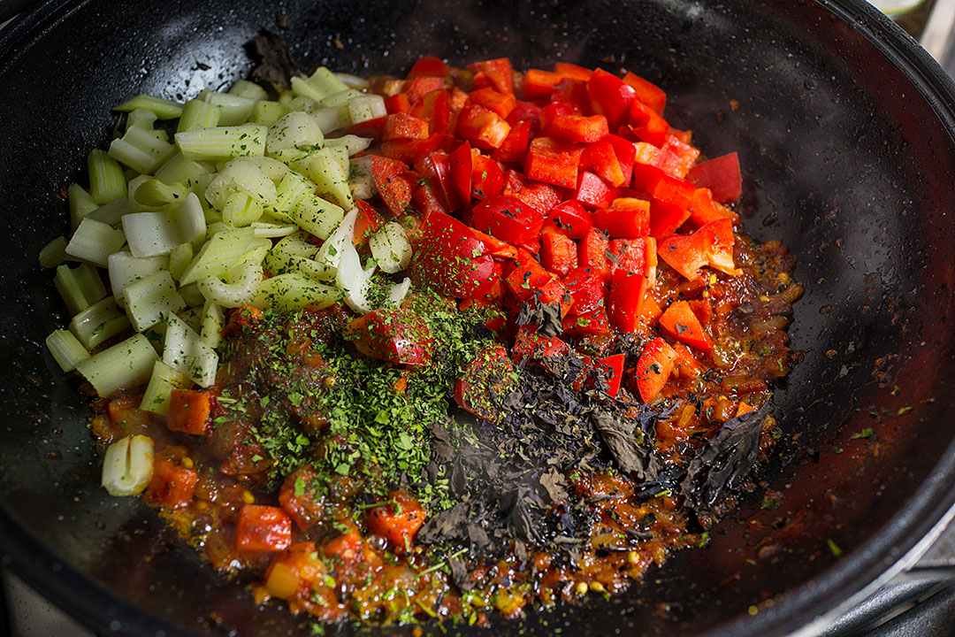 И этот соус абсолютно укладывается в современные узбекские традиции, потому что готовят его как обычно. После моркови кладут порезанные или протертые томаты, дают прижариться.