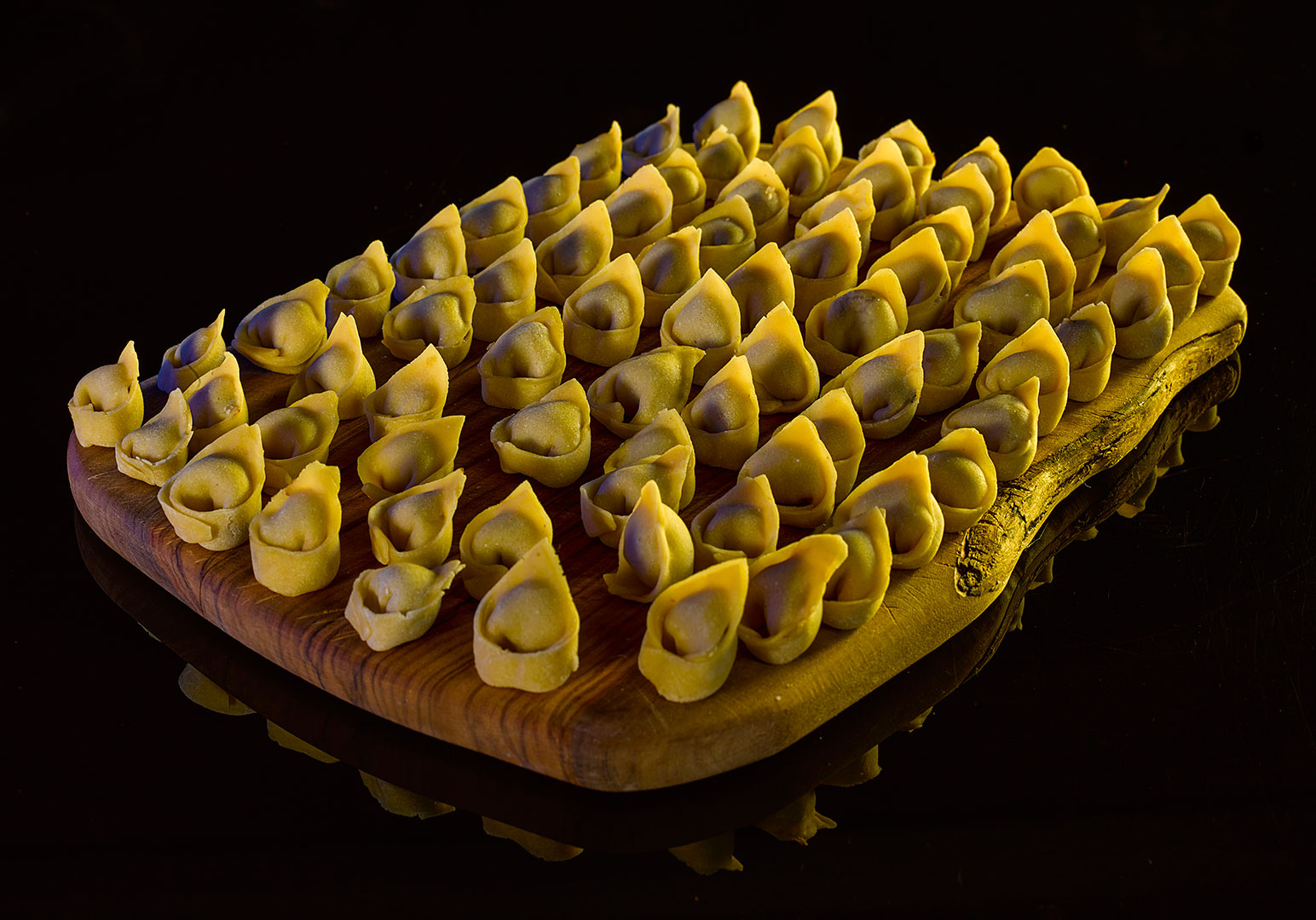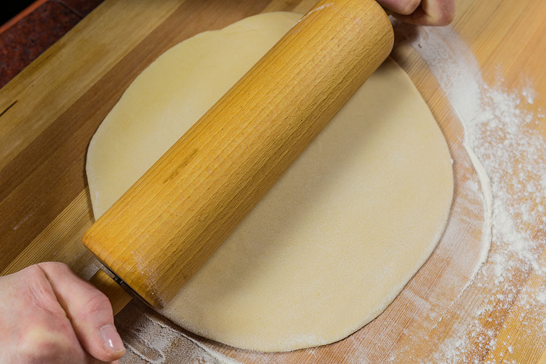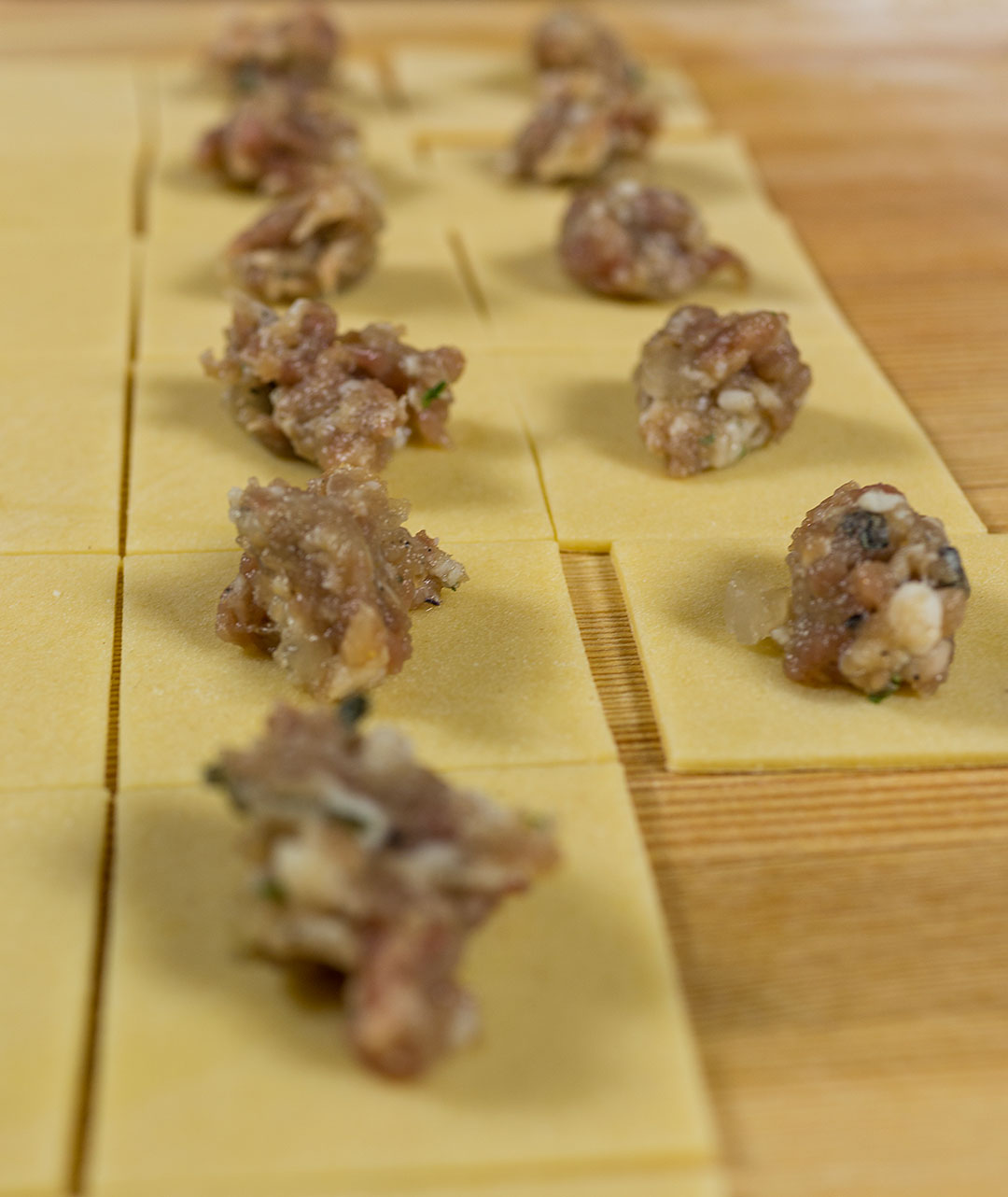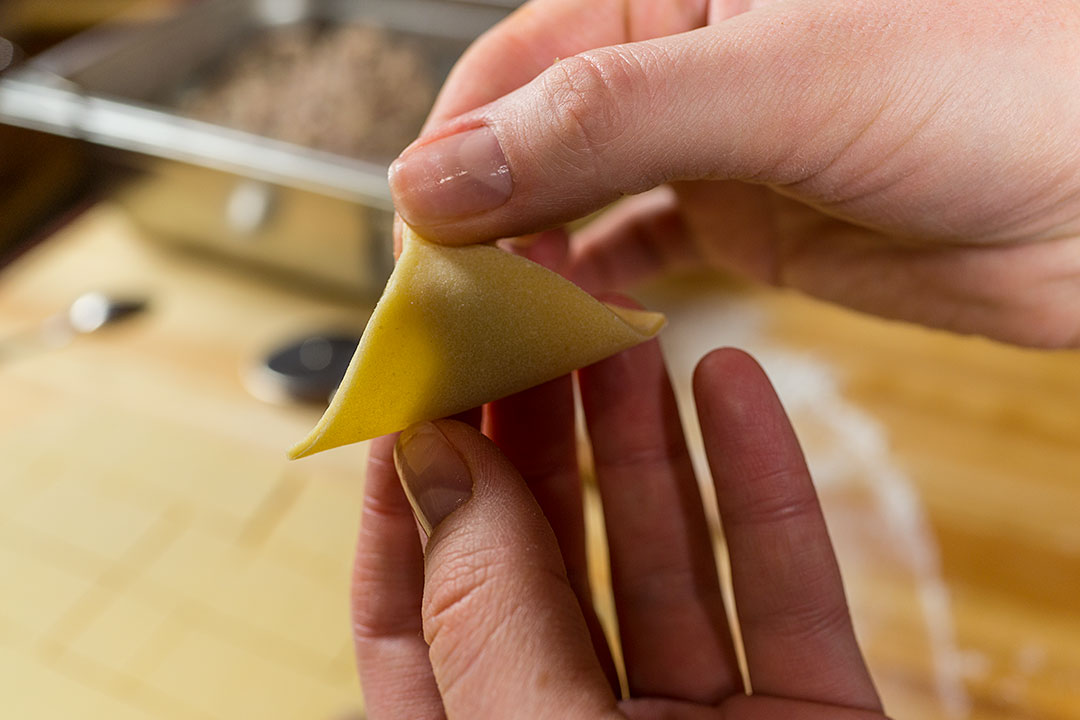 Вот и насчет теста я еще раз хочу посоветовать отклониться от традиционного теста для чучвары, которое мало чем отличается от русского пельменного теста. Я предлагаю пойти в сторону использования чуть большего количества яиц и сочетания обычной муки с мукой из твердых пород пшеницы Итак, на пять яиц стакан воды, соль, 700 грамм муки дурум, а обыкновенной муки - сколько попросит тесто. Или сразу положите килограмм обычной муки и постепенно добавляйте еще, сколько возьмет. Как это понимать? Вы начинайте месить и добавляйте муку до тех пор, пока тесто не окажется очень твердым, таким, чтобы его кусочки уже не желали липнуть в одно целое. Заверните тесто в пищевую пленку, дайте полежать минут тридцать-сорок, а когда оно станет мягче вымесите еще раз. Раскатывайте тесто в один большой, тонкий лист.
