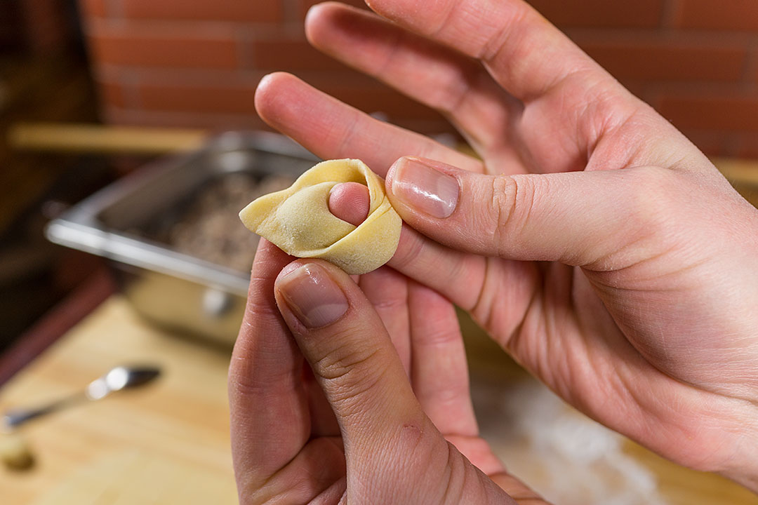 А теперь обернули два нижних края косынки вокруг мизинца - вот и готово! Знаете, можно тратить еще меньше времени - достаточно слепить верхний угол косынки и два нижних уголка друг с другом, фарш уже будет держаться внутри и не выпадет - многие так и делают и чучвара не становится от этого менее вкусной.