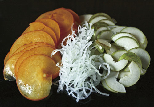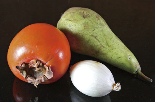 Дальше еще проще. Хурмы и грушу можно нарезать произвольно - тонкими или толстыми ломтиками, кружками или полукружьями - кому как нравится. А вот лук лучше порезать тонкими кольцами или полукольцами, хорошо его отжать и несколько раз тщательно промыть холодной водой, чтобы он стал менее резким и пахучим.