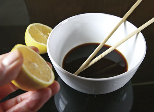 Смотрите, как в самом деле всё просто. Для соуса, чтобы заправить им салат из хурмы, груши и лука возьмем одну часть соевого соуса, добавим к нему одну часть растительного масла, выдавим сок половину лимона и всыплем чайную ложку сахарного песка. Почему я говорю о частях тех или иных продуктов, а не "сколько вешать в граммах", думаю, понятно. Чем больше (в количественном отношении) фруктов и овощей используется для салата, тем бОльший объем составных частей соуса понадобится для его приготовления. Для одной хурмы, груши и небольшой головки лука я взял по две столовой ложки масла и соевого соуса, добавил лимонный сок и сахар, а затем стал выравнивать баланс между кислым, сладким и соленым, понемногу добавляя сахар или лимонный сок. Словом, соус по вкусу должен получиться в равной степени соленым, кислым и сладким, без преобладания какого-либо вкусового оттенка из указанных продуктов.