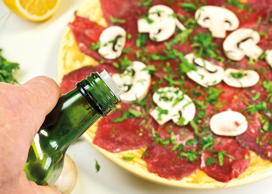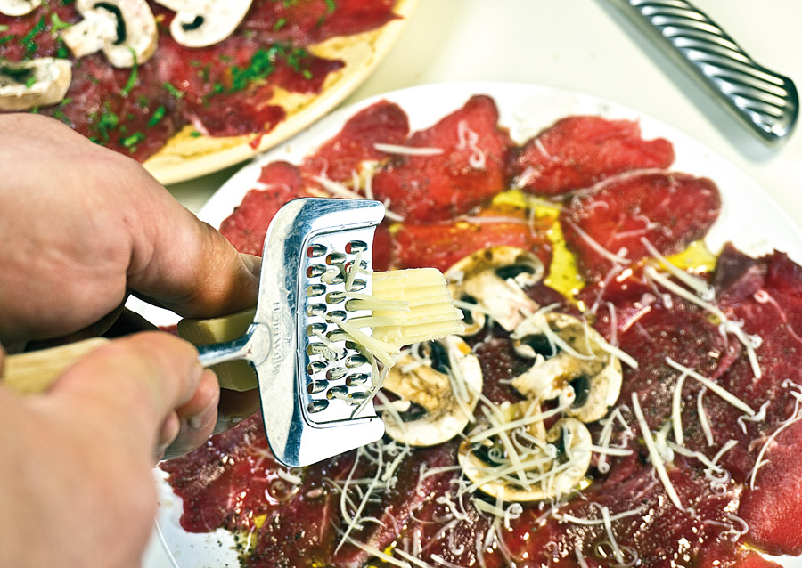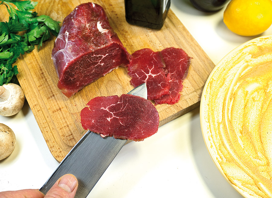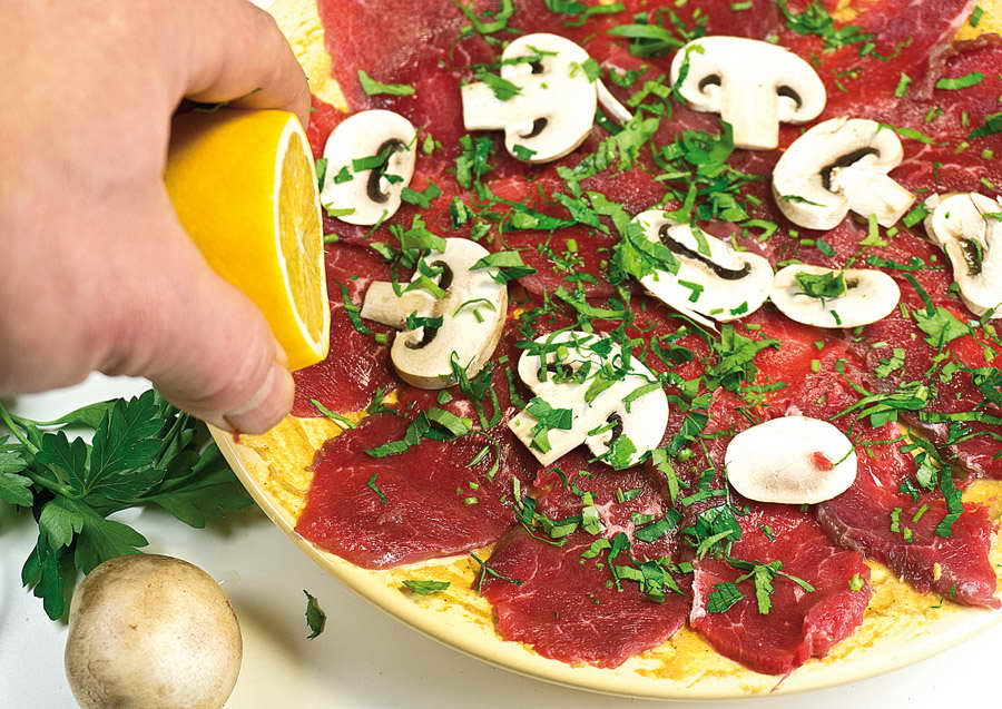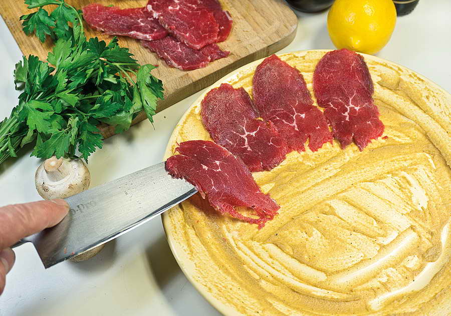 Бывало, припрешься с работы домой, хорошенько измотанный, и понимаешь: на то, "чтобы что-то сварганить", нет ни времени, ни сил, а запасов, вроде задубевшей пачки скомканных пельменей годовалой давности, у тебя отродясь никогда не водилось и не заведется. Карпаччо! Вот что иногда способно выручить "отца русской демократии", хотя, как известно, носителю этого титула Кисе Воробьянинову, который "ne mange pas six jours", сгодились бы и пельмени. Но всё же... Готовится карпаччо молниеносно, во множестве вариаций, а что касается куска говяжьей вырезки - основы мясного карпаччо - стыдно его не иметь в морозилке. Тем более что, как правило, он попадает туда по определению и даже закономерно. Почему? Ну вы же иногда покупаете вырезку на рынке - ну, чтоб пожарить филе-миньон, например. Эта особая мышца в говяжьей туше редко бывает весом менее двух килограммов, и продается она только целиком. Ну сколько вы за раз нажарите из неё миньонов? То есть какая-то часть по любому останется. И в морозилке (для карпаччо) ей самое место. Во-первых, очень тонко можно нарезать только замороженное мясо. А во-вторых, что общеизвестно: любое сырое мясо, выдержанное в морозилке не менее пяти дней, гарантированно становится безопасным, ежели, паче чаяния, по части ветеринарного контроля за таким мясом возникли подозрения. У слабо разбирающихся в продуктах такое случается, хотя, наверное, дело не в подозрительности, а в предубежденности. Но мы эту тему обойдем стороной, вернувшись к карпаччо и к замороженной вырезке.
