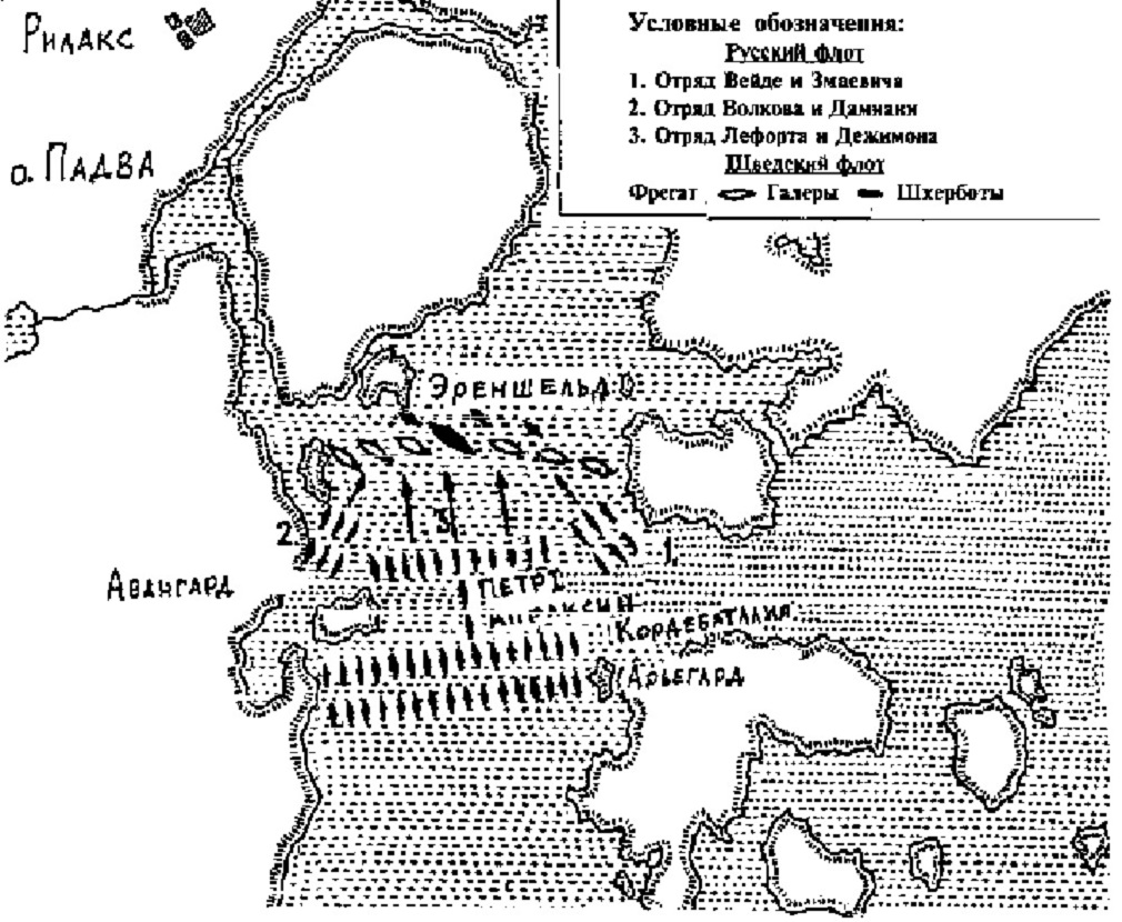 (26 июля) 6 августа 1714 года наступил штиль, лишивший шведские парусные суда свободы маневра. Петр этим воспользовался. Его галеры обошли шведов и блокировали их в Рилакс-фьорде. На предложение сдаться шведский контр-адмирал ответил отказом.