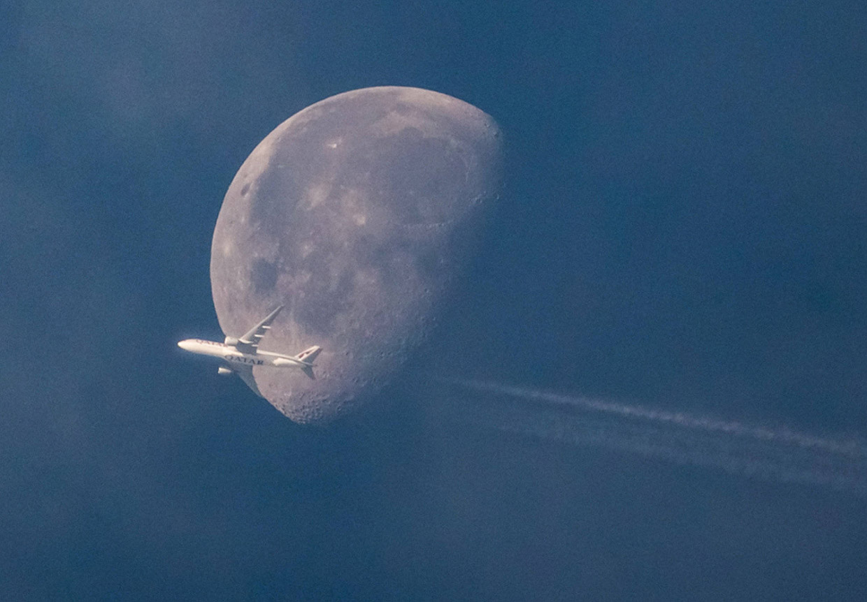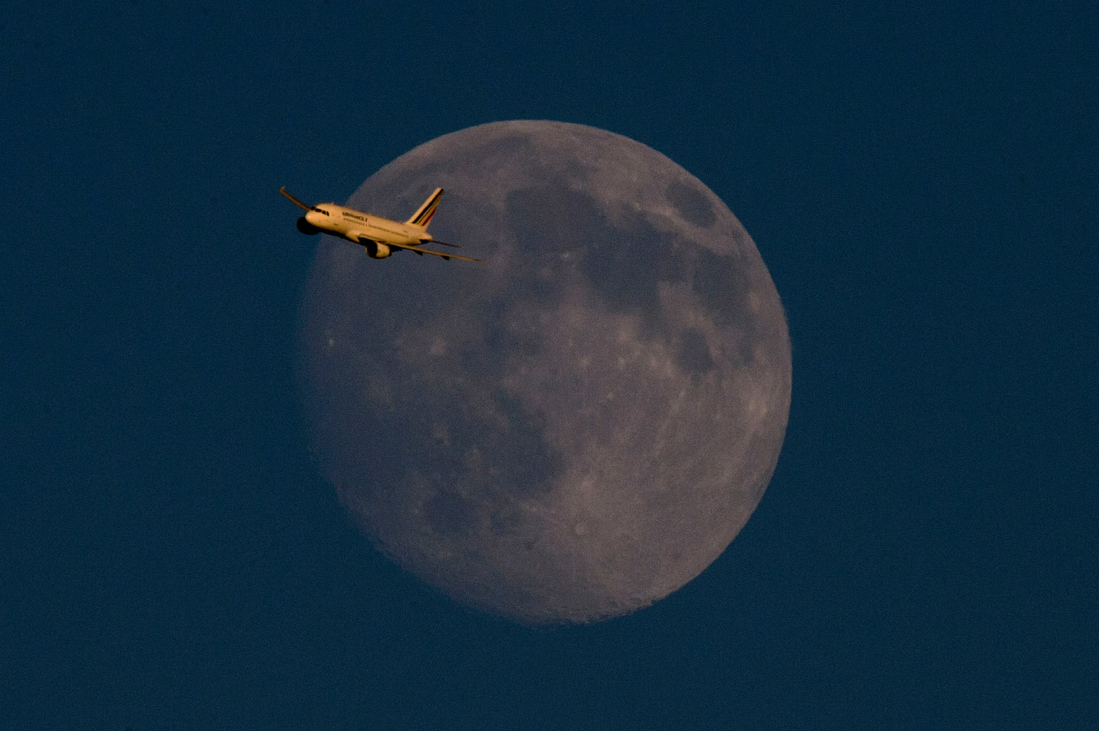 Полнолуние и самолёт, летящий из Парижа в Лондон, 17 июля 2016. (Фото Anthony Devlin).