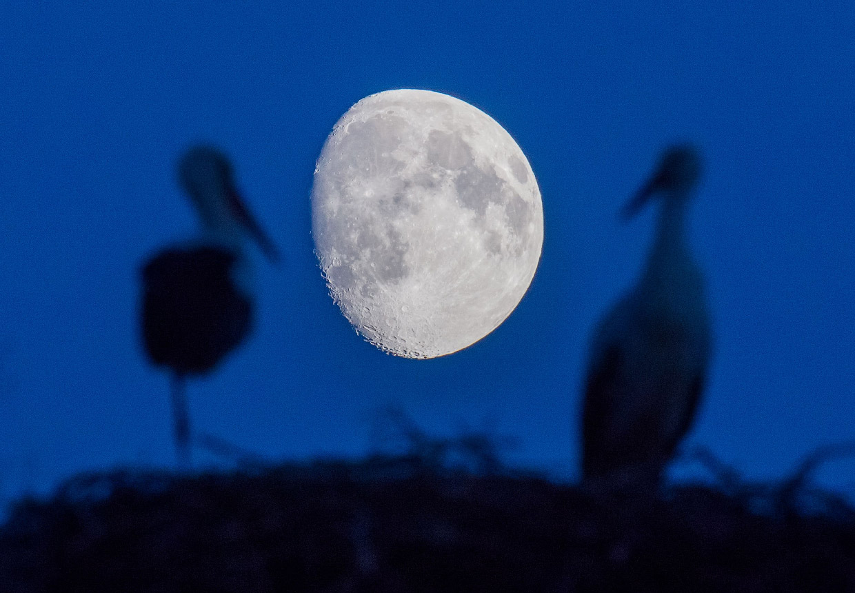 Полнолуние в Германии и аисты, 14 августа 2016. (Фото Patrick Pleul).