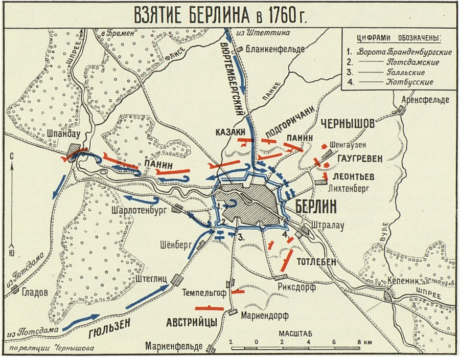 Назначив на утро общий штурм столицы Пруссии, Чернышев приказал артиллеристам еще ночью открыть интенсивный огонь по городу. После 1 200 залпов, 9 октября 1760 года русские войска, практически без сопротивления вошли в город, а гарнизон сложил оружие. Позже стало известно, что прусские генералы еще под покровом ночи покинули город, ночью сдав город генералу Тотлебену (что характерно – этническому немцу). И в пять часов утра русские кавалеристы Тотлебена уже стояли у королевского дворца.