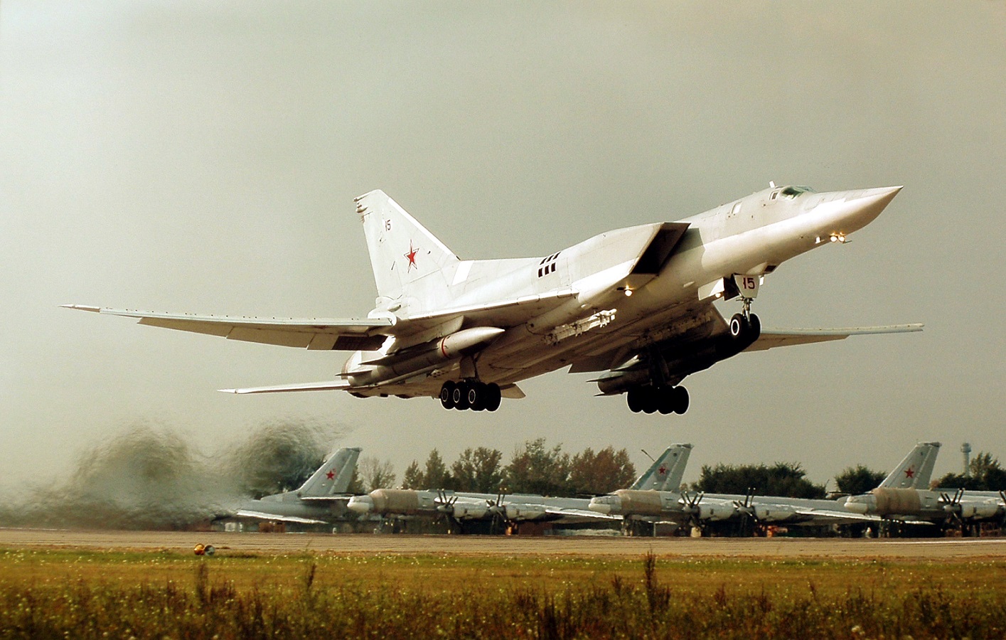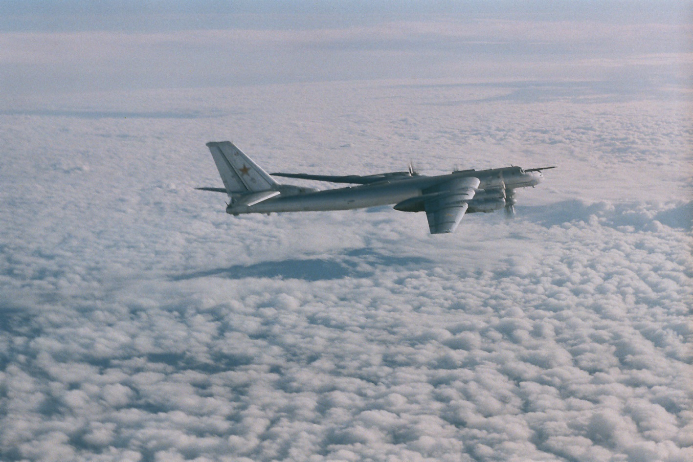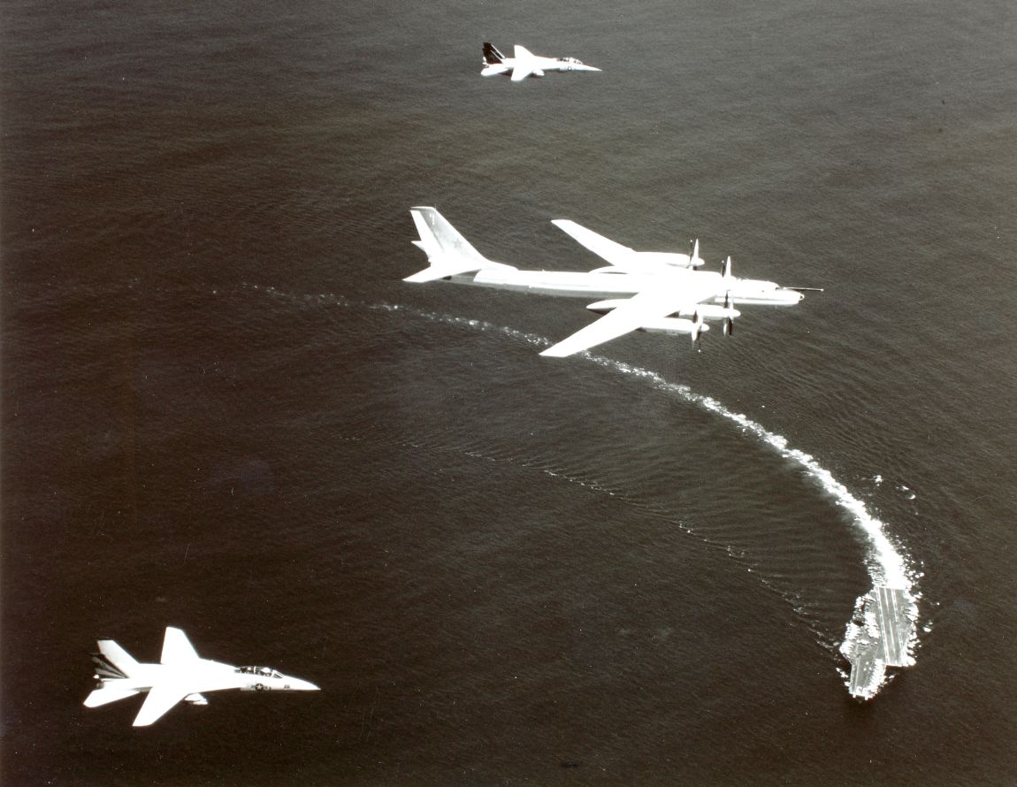 В 1961 году на вооружение ДА поступили сверхзвуковые дальние бомбардировщики Ту-22 и ракетоносцы Ту-16К, Ту-95К. «Уважают»: американские истребители (Grumman F-14A) сопровождают Ту-95, а на заднем плане — авианосец («Kitty Hawk»).