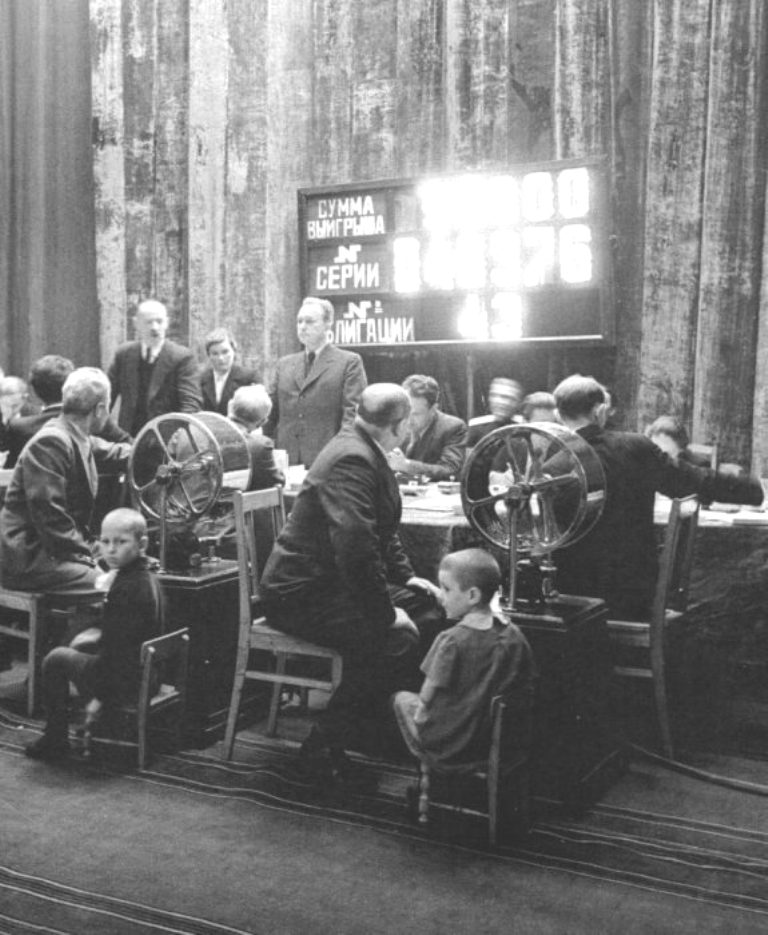 Официальное объявление выигрыша в 50.000 рублей во время розыгрыша трёхпроцентного выигрышного займа.