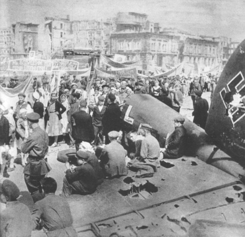 Первомайская демонстрация в разрушенном Сталинграде. На переднем плане хвост сбитого немецкого бомбардировщика Хейнкель He-111. 1 мая 1943 года.
