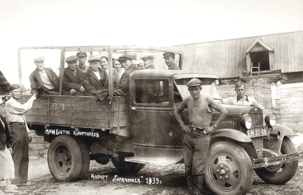 Прибытие отдыхающих на курорт «Горячинск». Село Горячинск, Бурятия, РСФСР, СССР.1939 год. Село расположено на берегу озера Байкал в 188 км к северо-востоку от города Улан-Удэ, с которым связано автомобильным сообщением. Село названо в честь целебных горячих источников. Здесь располагается первый на Байкале бальнеологический курорт с одноименным названием. Песчаные пляжи, живописная бухта, озонированный морской воздух и горячие источники прекрасно подходят для отдыха и лечения. В районе села сложился особый микроклимат, несколько более теплый зимой и прохладный летом.