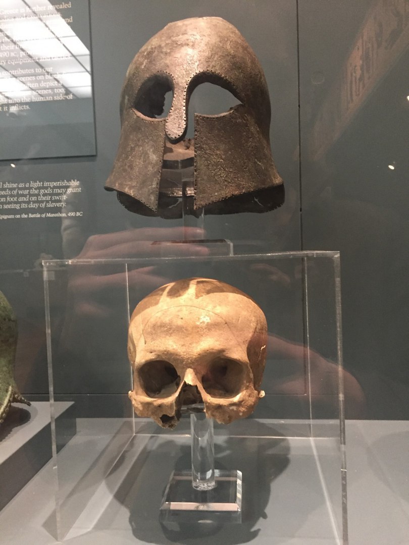 Шлем и голова греческого воина, погибшего в Марафонской битве с персами, 490 г. до н. э