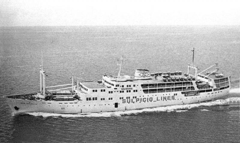 ("Донья Пас" в 1980 году, тогда этот построенный в Японии корабль назывался "Дон Сульписио". На борту крупными буквами написано название судовладельца.)