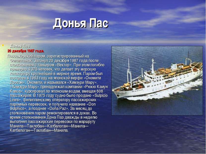 30 лет назад, 20 декабря 1987 года, произошла крупнейшая в истории морская катастрофа, почти в три раза превзошедшая по количеству жертв безумно распиаренный Кэмероном "Титаник".Филиппинский грузопассажирский паром "Донья Пас", совершавший регулярный рейс из Манилы в Таклобан, столкнулся с танкером "Вектор", перевозившим более 1000 кубометров бензина.