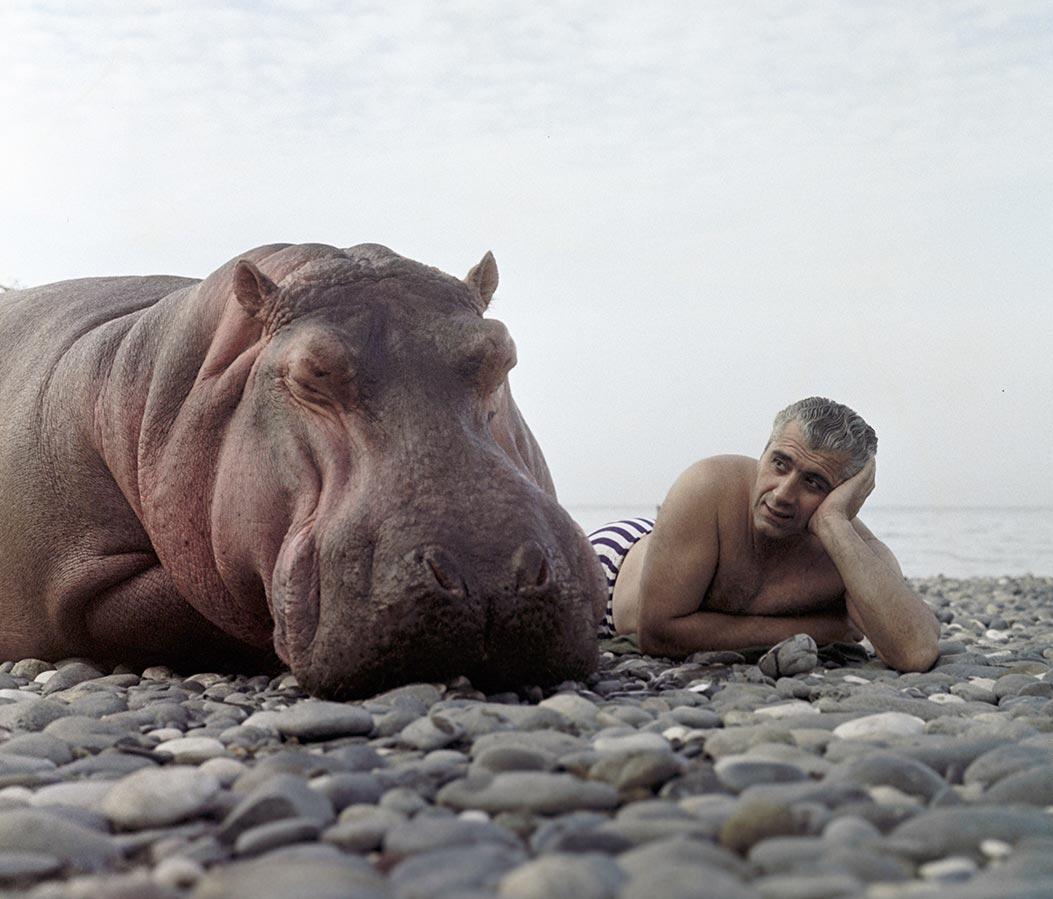 Дрессировщик Степан Исаакян (справа) на черноморском пляже, 1967 год.