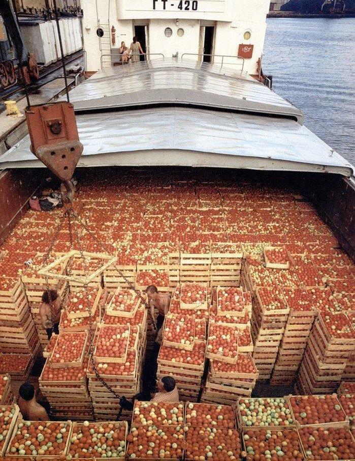 Разгрузка сухогруза с яблоками, Москва, 1970-е.