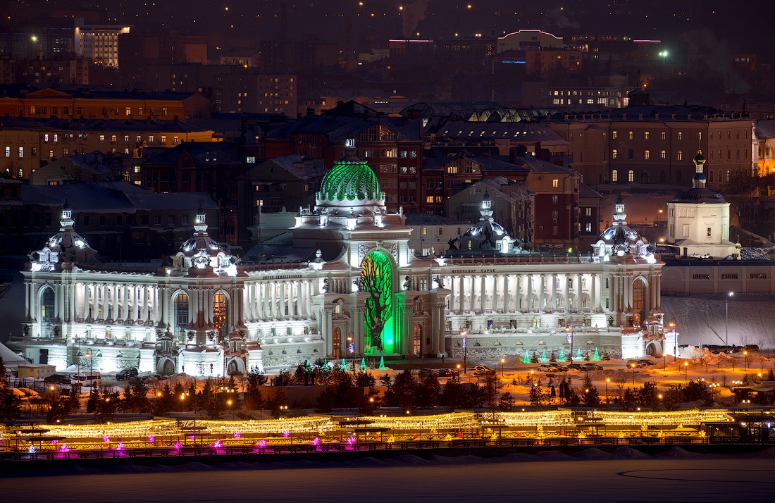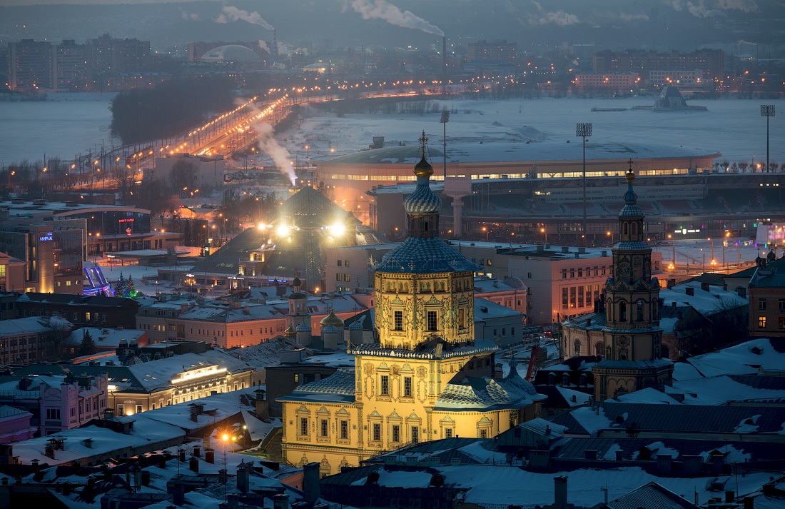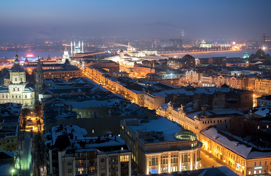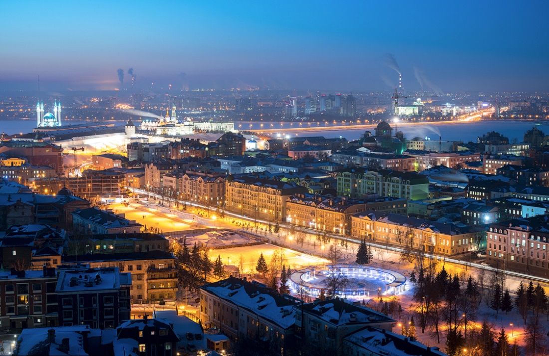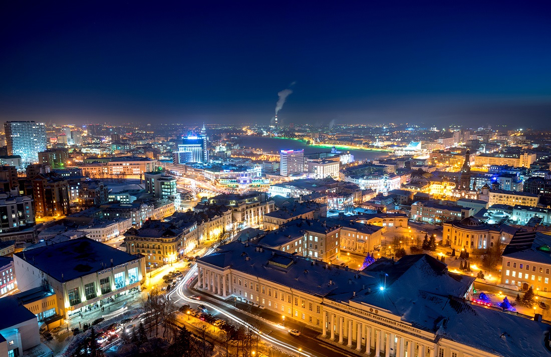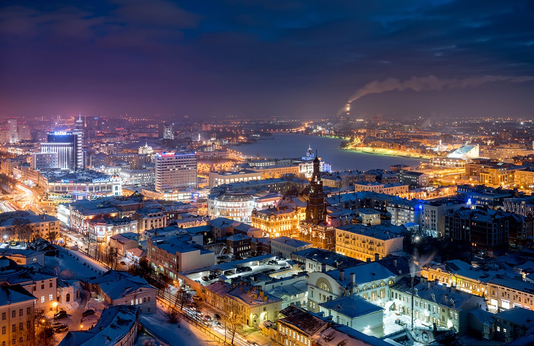 Огни ночной Казани. Зимний морозный город с высоты птичьего полета.