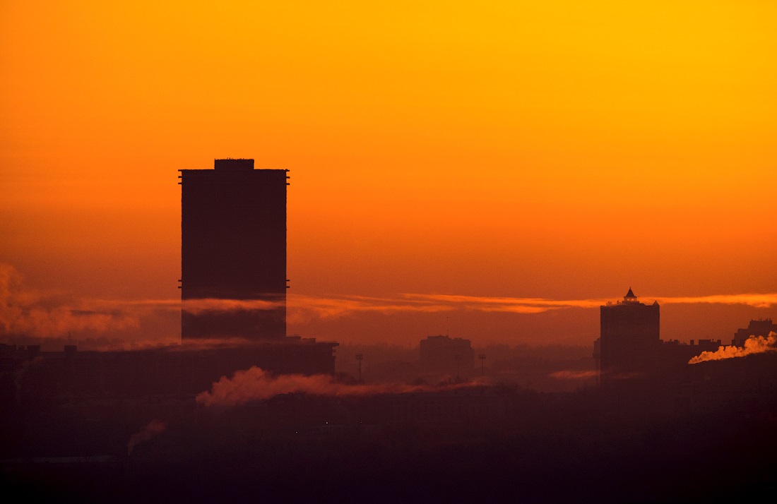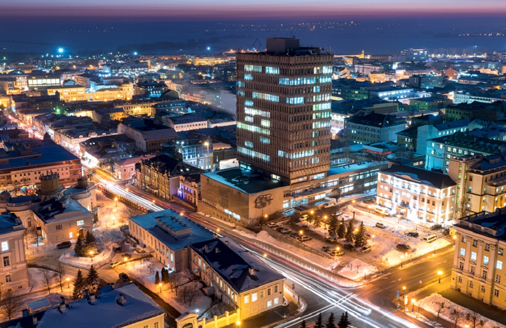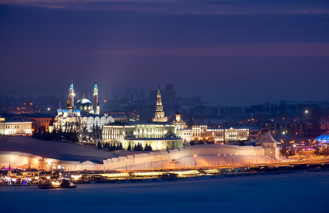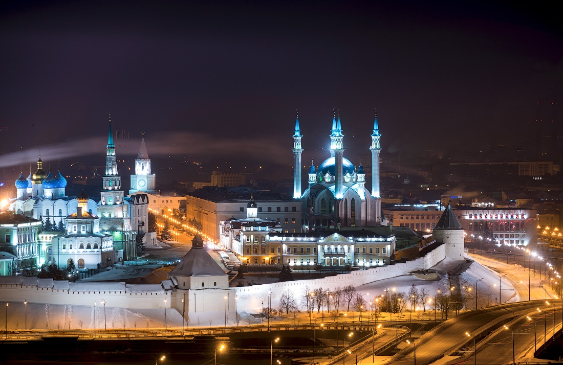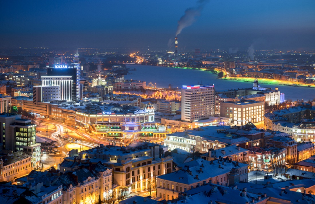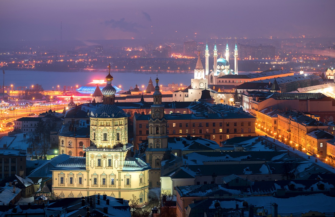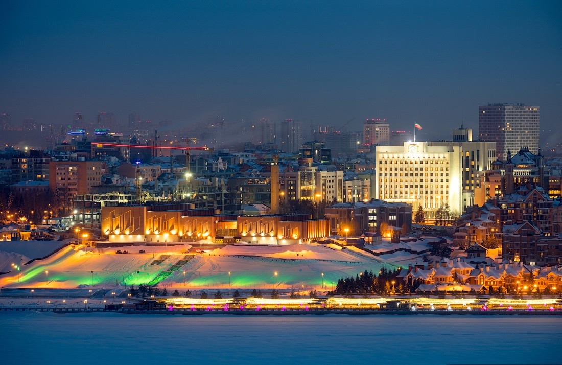 Огни ночной Казани. Зимний морозный город с высоты птичьего полета.