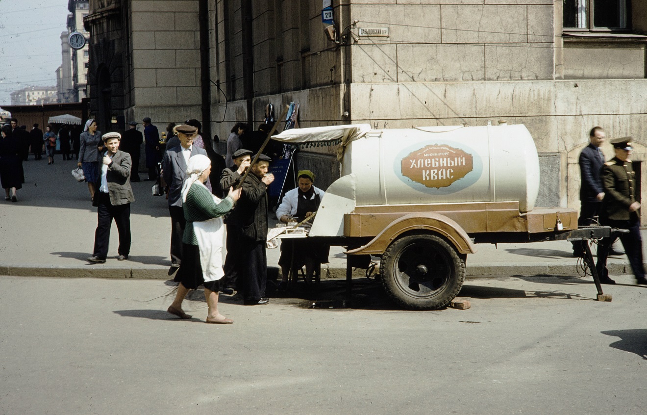 Торговля квасом на углу Краснопрудной улицы и Давыдовского переулка, Москва, 1959 год.