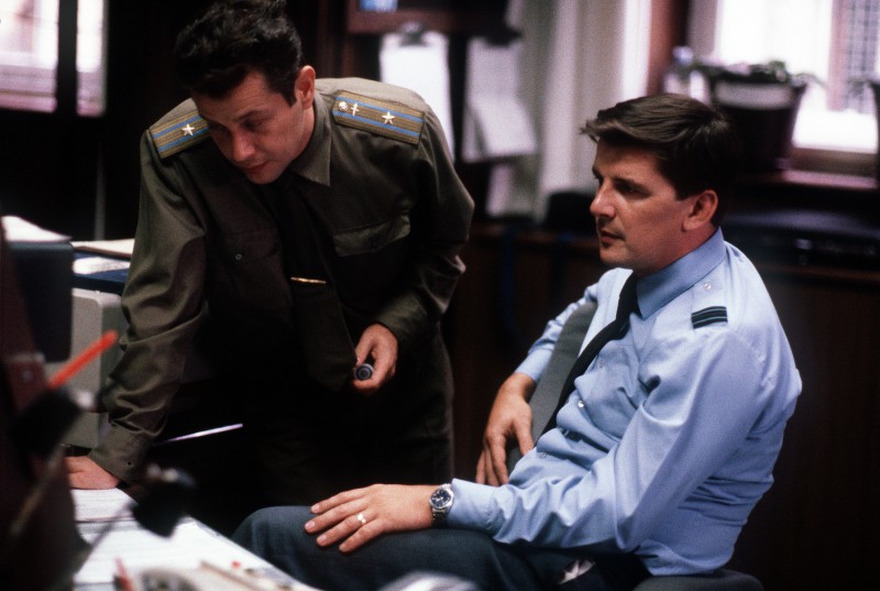 Советский майор Владимир Журба и лейтенант британских ВВС Найджел Томас следят за монитором в Берлинском центре безопасности полетов (BASC), осуществляя контроль гражданских и военных воздушных перевозок в небе над Берлином, 1989 год.