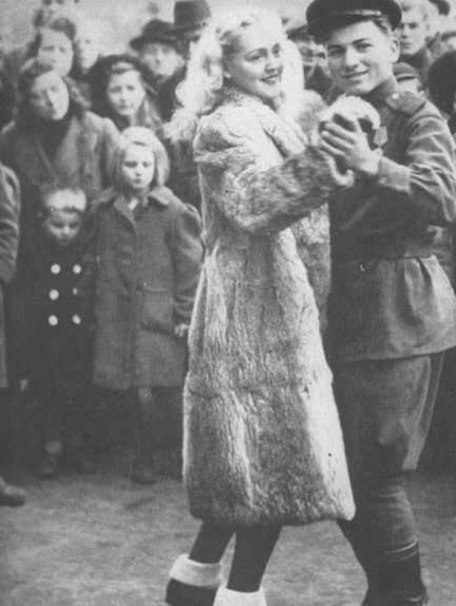 Советский военнослужащий и немецкая девушка танцуют польку. Берлин, 1945 г.